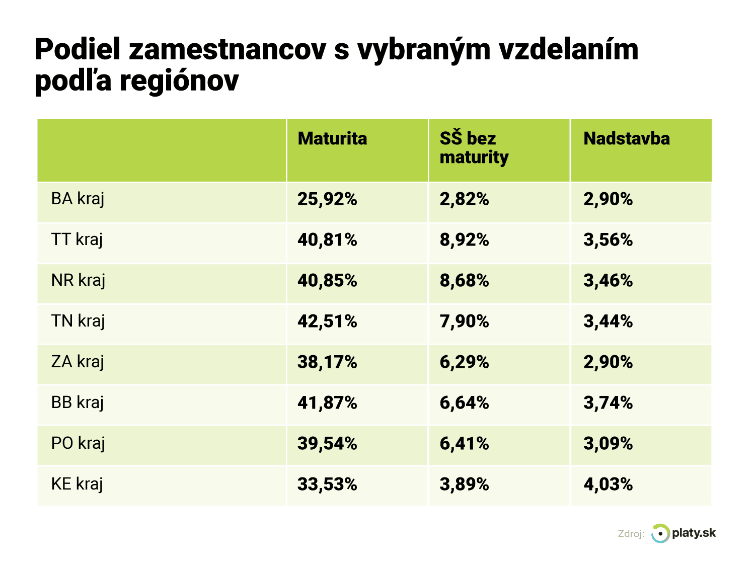 Analýza portálu Platy.sk ukazuje, že ukončené univerzitné vzdelanie je najrozšírenejšie vo všetkých regiónoch na Slovensku. Na druhom mieste sú pracovníci s maturitou. Ich najvyšší podiel môžeme sledovať v Trenčianskom a Banskobystrickom kraji.