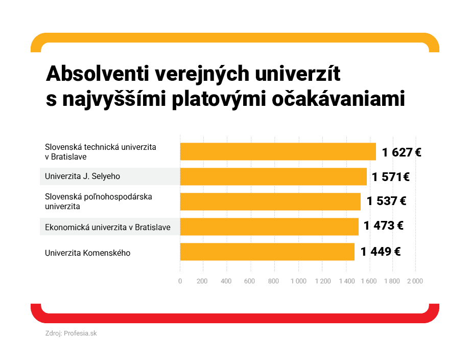 Analýza sa bližšie pozrela aj na univerzity a fakulty. Najvyššie finančné ohodnotenie očakávajú absolventi a absolventky Slovenskej technickej univerzity v Bratislave. Priemerný ponúkaný plat v inzerátoch, na ktoré reagovali, bol 1 627 eur. O 56 eur menej očakávajú absolventi a absolventky Univerzity J. Selyeho, zárobok 1 537 eur mesačne si predstavujú absolventi Slovenskej poľnohospodárskej univerzity.