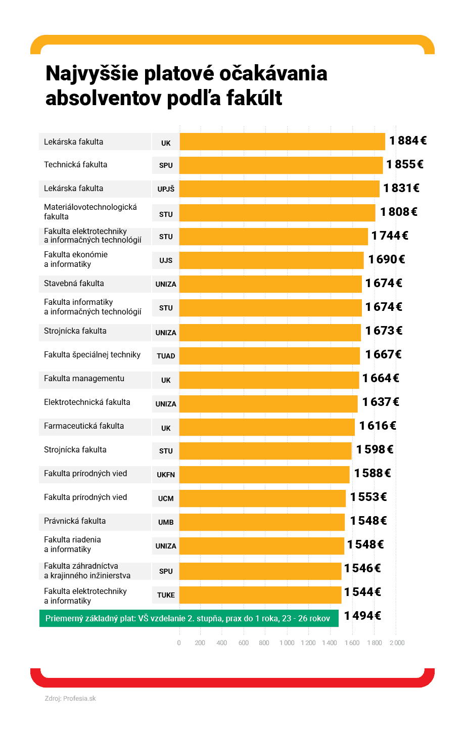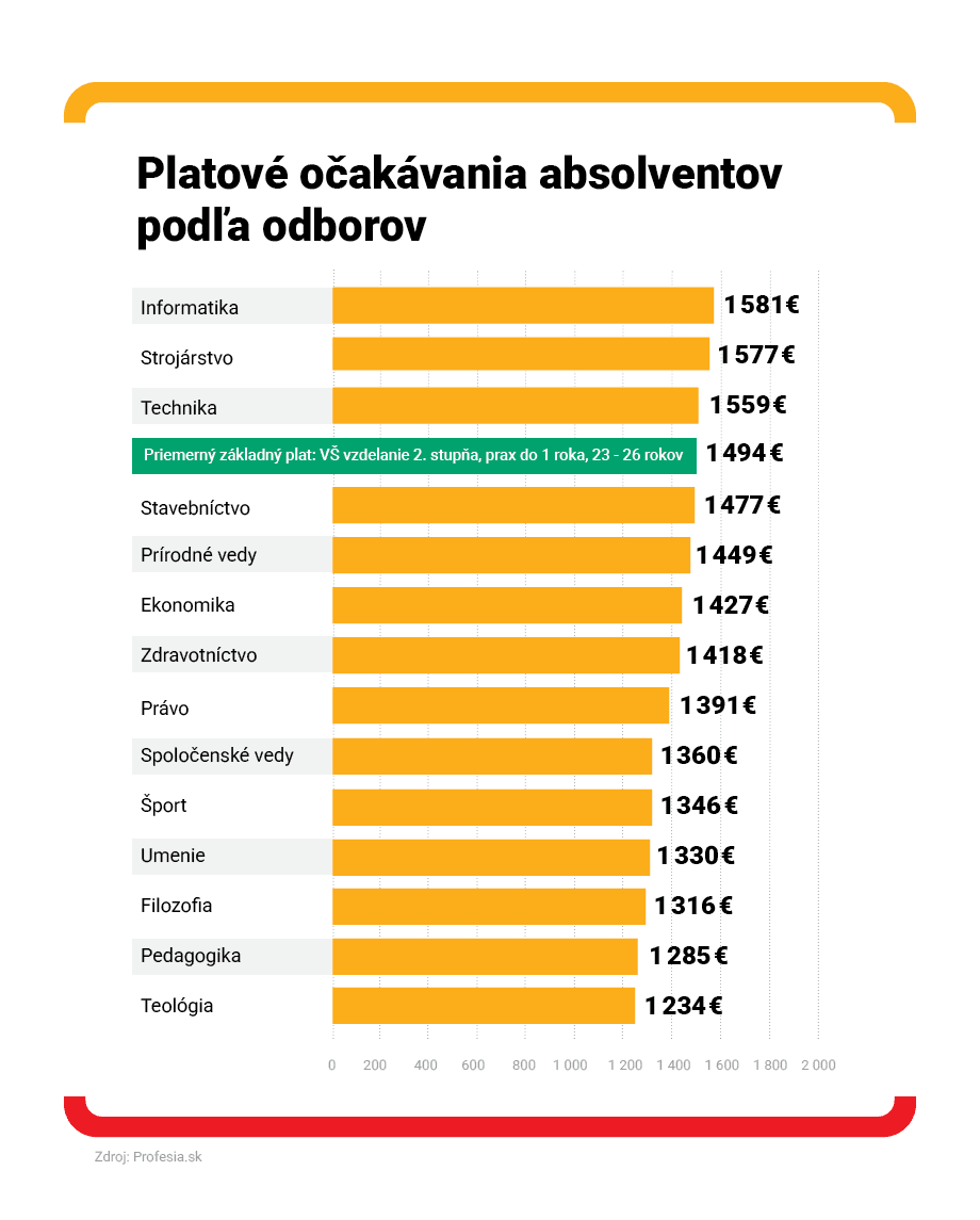 Najvyšší priemerný ponúkaný plat v inzerátoch, ktoré vyžadujú vysokoškolské vzdelanie 2. stupňa a sú vhodné pre absolventky a absolventov, je na pozície lekárov a lekárok. Úspešní študenti a študentky tohto zamerania tak majú právom vysoké očakávania. Na čele sú absolventi Lekárskej fakulty Univerzity Komenského, ktorí v priemere očakávajú 1 884 eur, tretích „najdrahších“ absolventov má Lekárska fakulta Univerzity P. J. Šafárika, ktorí si predstavujú o 50 eur nižší mesačný plat. Druhé najvyššie mzdové očakávania majú absolventi Technickej fakulty Slovenskej poľnohospodárskej univerzity.