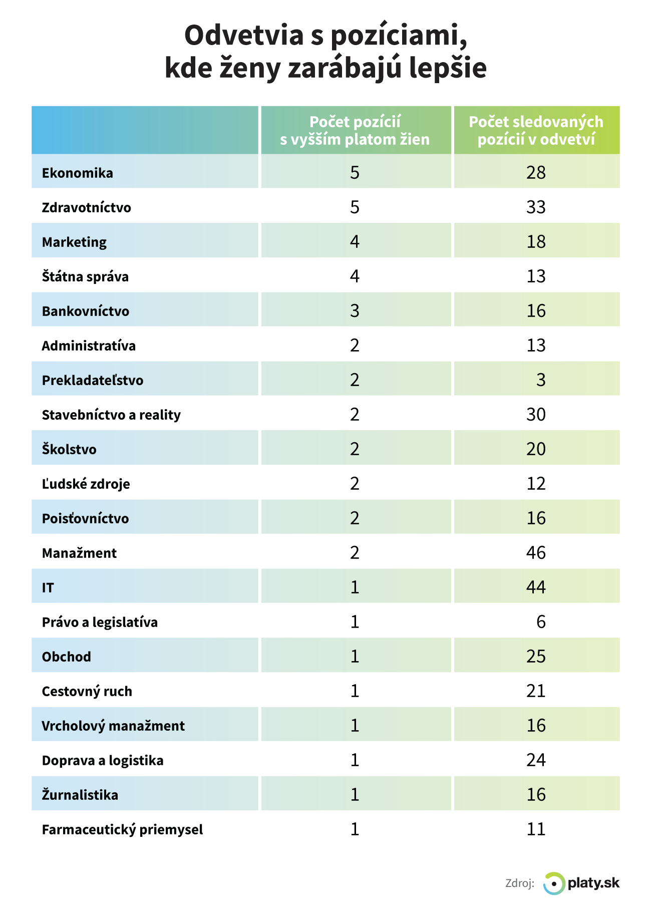 Najviac pozícií, pri ktorých podľa Platy.sk evidujeme vyšší priemerný plat pri ženách, je v odvetví ekonomika a zdravotníctvo. V oboch prípadoch ide zhodne o päť pozícií.