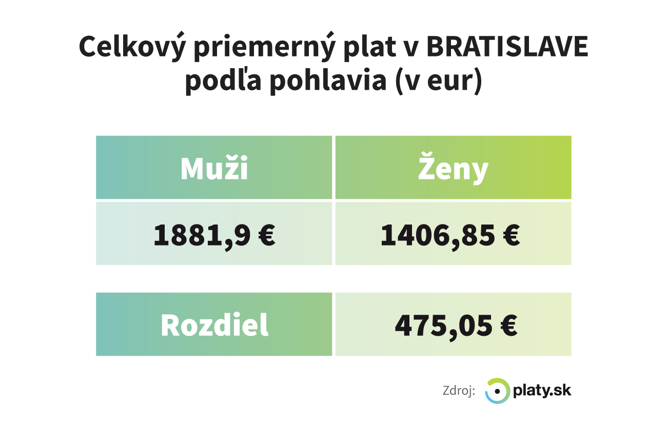 475 eur. Táto suma dnes predstavuje rozdiel medzi celkovým priemerným platom ženy a muža v hlavnom meste. Vyplýva to z analýzy portálu Platy.sk, ktorý patrí do portfólia spoločnosti Profesia. Celkový priemerný plat ženy tu predstavuje približne 1407 eur v hrubom. Bratislavský zamestnanec má 1882 eur v hrubom.
