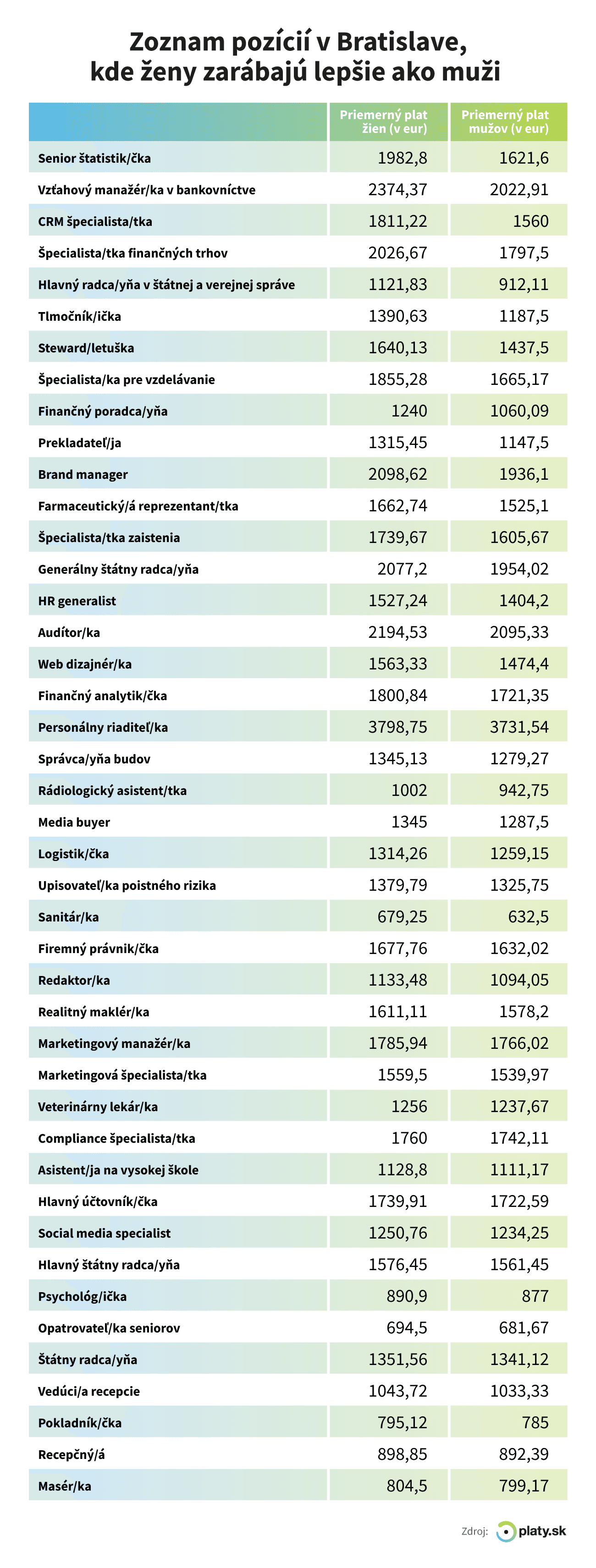 Najvýraznejší platový rozdiel medzi vyšším platom ženy a platom muža možno vidieť pri pozícii senior štatistik/čka. Bratislavská zamestnankyňa na tejto pozícii zarobí v priemere 1983 eur v hrubom. Celková priemerná mzda mužského zamestnanca v rovnakom meste predstavuje 1621 eur v hrubom.