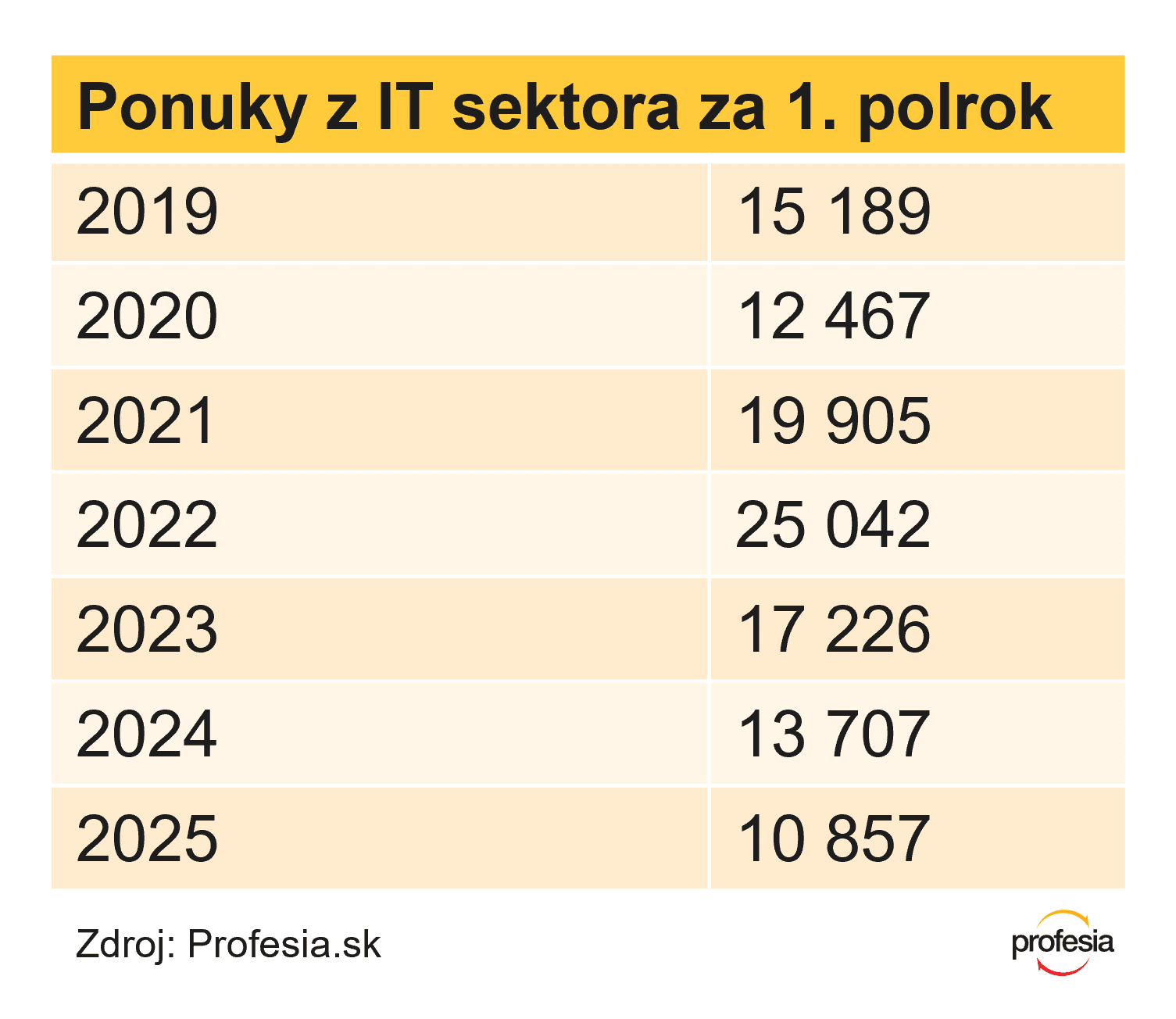 V dôsledku pandémie nastal obrovský nárast dopytu po pracovníkoch a pracovníčkach na pozície v IT sektore. V roku 2022 bolo na portáli Profesia.sk zverejnených takmer 46-tisíc inzerátov, vlani už necelých 25-tisíc. Okrem toho, že trh práce najprv „vytriezvel“, je práve IT sektor jedným z tých, ktoré sa v dôsledku technológií menia najdynamickejšie. Pri porovnaní počtu ponúk za 1. polrok eviduje tento rok portál v porovnaní s rokom 2022 pokles o 57 percent, porovnanie s 1. polrokom 2023 ukazuje 37-percentný zostup.