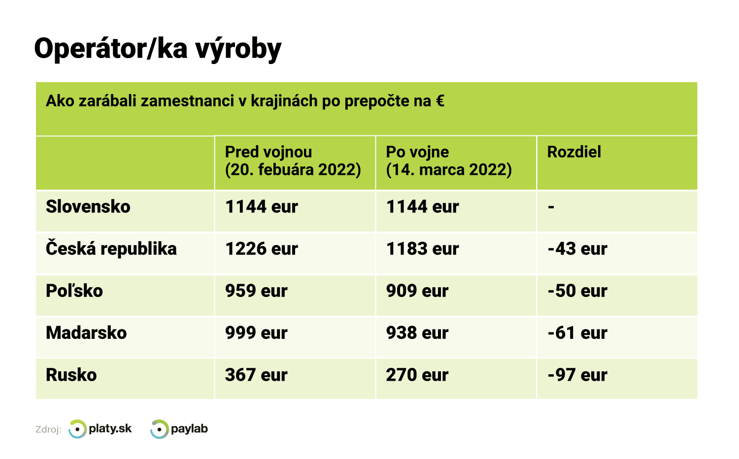 Platy ruských operátorov výroby sú dnes až štyrikrát nižšie, ako je priemerný plat týchto zamestnancov na Slovensku. Priemerná hrubá mzda u nás predstavuje podľa Platy.sk 1144 eur v hrubom.