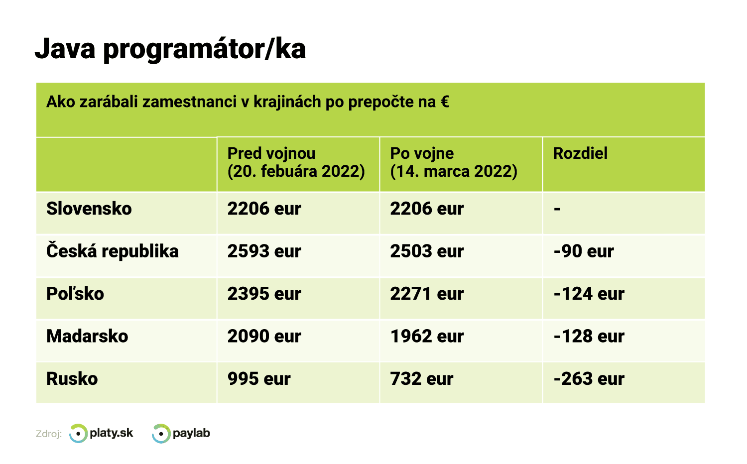 Java programátor alebo programátorka v Rusku zarábal/a pred vojnou v prepočte takmer 1000 eur v hrubom. Hodnota mzdy sa tak v Európe za krátky čas prepadla až o 263 eur hrubom a dnes predstavuje len 732 eur.