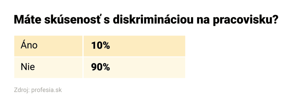 Výsledky unikátneho prieskumu ukázali, že desatina respondentov má skúsenosť s istou formou diskriminácie v práci. Najčastejšie sa týkala veku, názoru a pohlavia. Z tých, ktorí zažívajú diskrimináciu na pracovisku, až polovica uviedla, že musia pracovať usilovnejšie, aby dosiahli rovnaké uznanie a zaobchádzanie ako ostatní. Tretina nám tiež uviedla, že ich práca je pod dôkladnejšou kontrolou ako práca ostatných a taktiež sa cítila v práci ponižovaná.