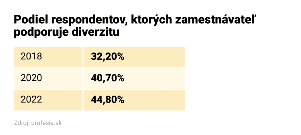 Porovnanie s prieskumami z predošlých rokoch odhalilo pozitívny vývoj v podpore diverzity zo strany zamestnávateľov. Aktuálne ju vo zo strany svojej firmy vníma takmer 45 percent respondentov. V roku 2018 to bolo 41 a v roku 2018 32 percent.