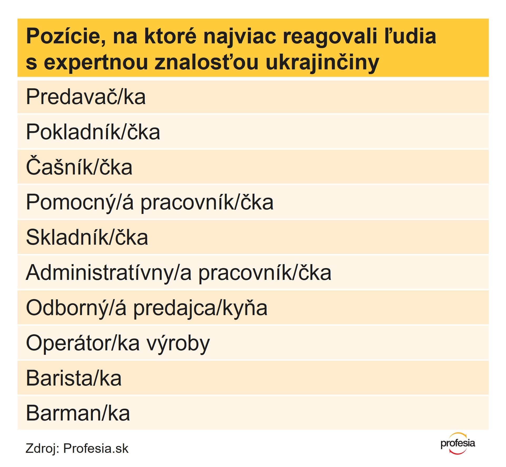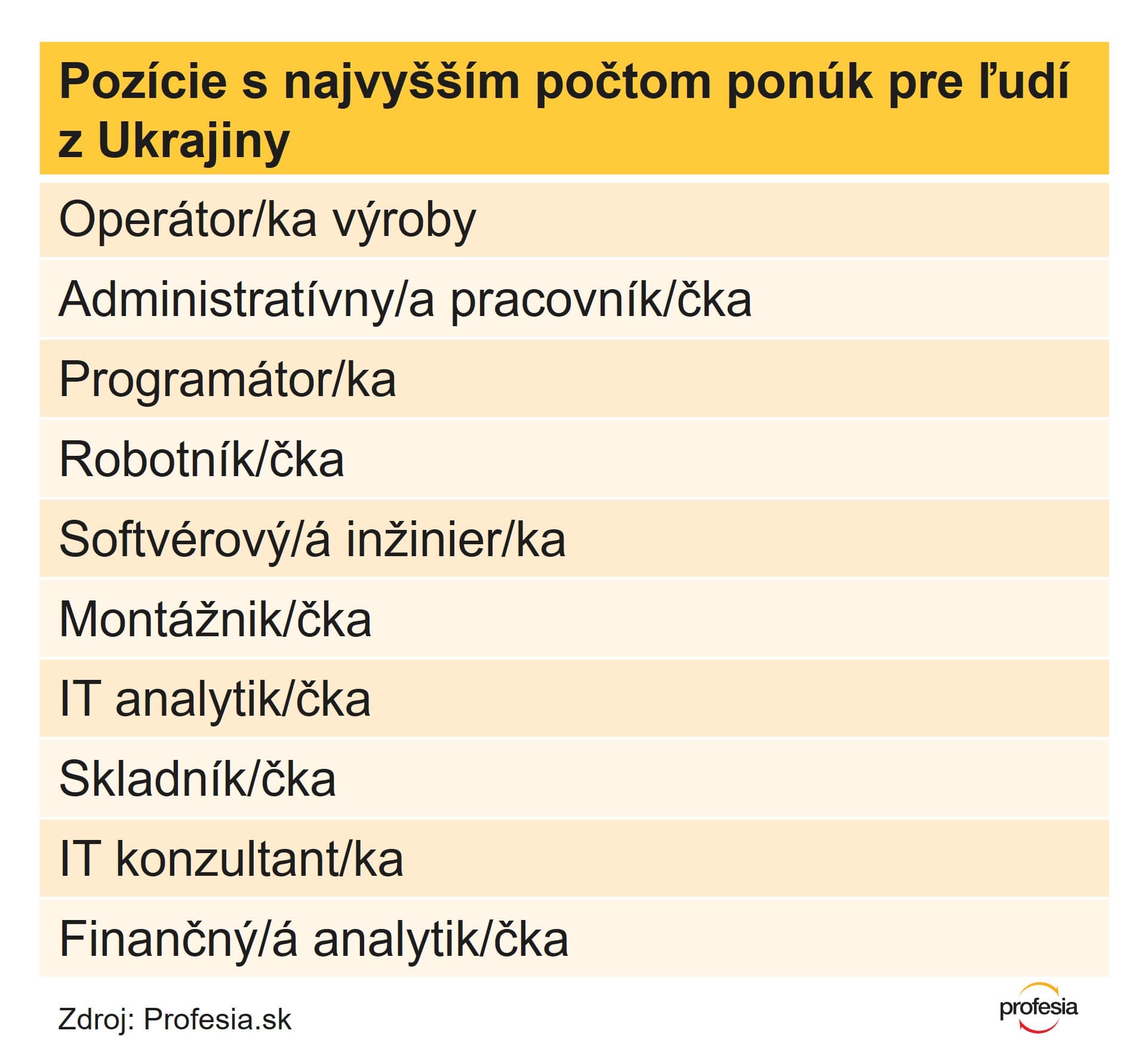 Najčastejšie inzerovaná pozícia, ktorú spoločnosti označili ako vhodnú pre Ukrajincov a Ukrajinky, je operátor/ka výroby. Ponuky práce na túto pozíciu zvýraznili firmy ukrajinskou vlajkou viac ako 6 300-krát. Nasleduje administratívny pracovník/čka, programátor/ka, robotník/čka a softvérový inžinier či inžinierka.