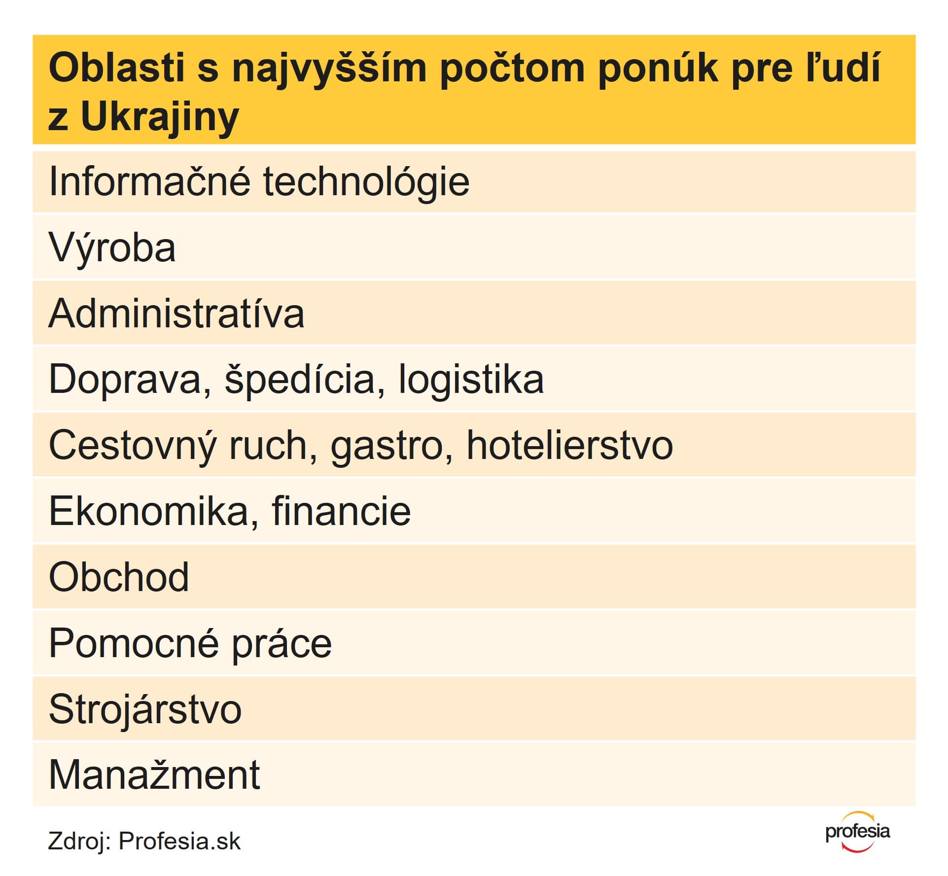 Za dva roky Ukrajinci a Ukrajinky najviac reagovali na pozície z obchodu, 2 400 uchádzačiek a uchádzačov reagovalo na spolu viac ako 7-tisíc inzerátov z tejto oblasti. Veľký záujem tiež mali o zamestnanie v cestovnom ruchu a gastre, pomocných prácach a doprave. Najatraktívnejšími pozíciami boli predavač/ka, pokladník/čka a čašník/čka.
