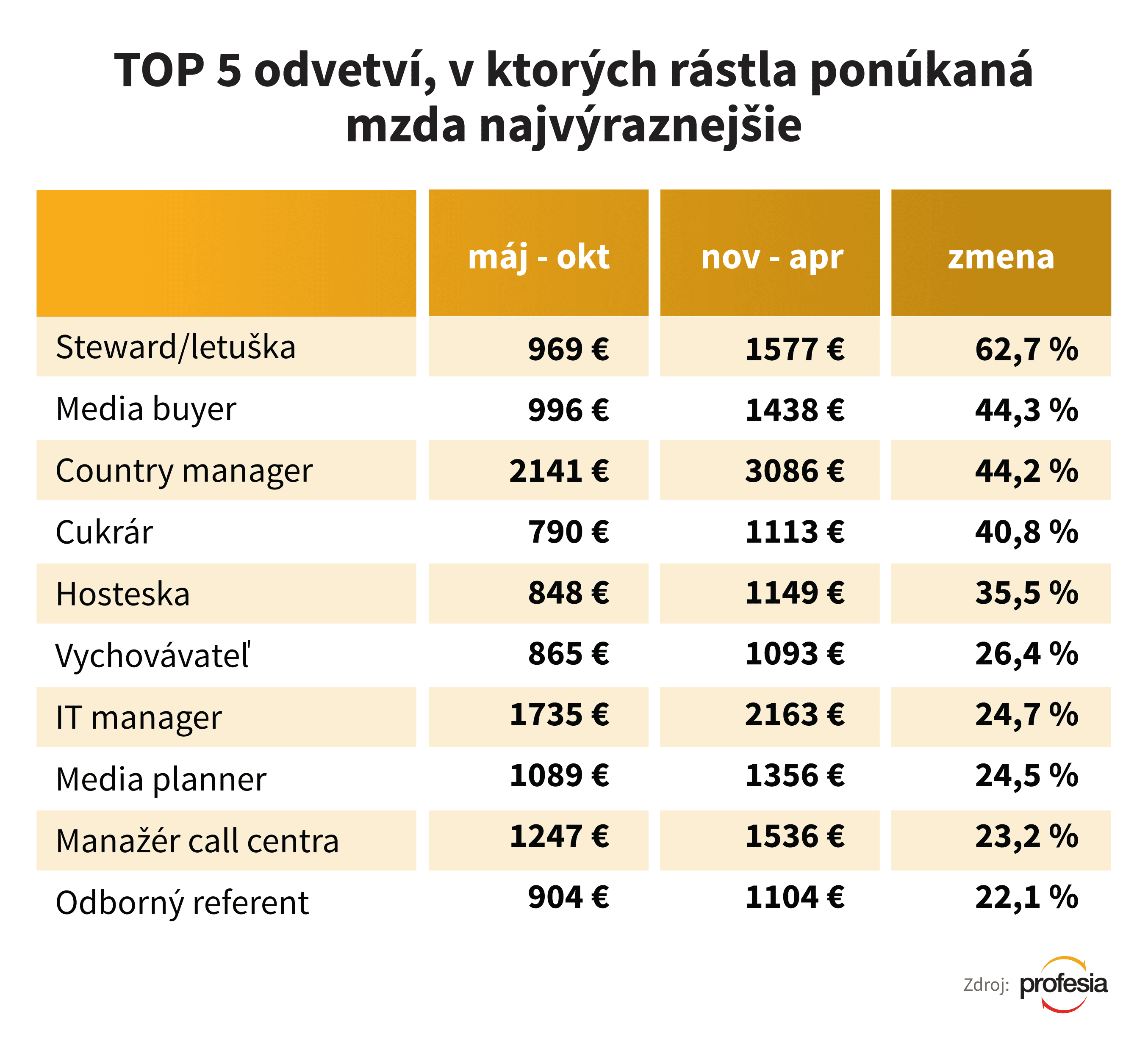 V TOP 10 pozícií s najvyšším rastom ponúkanej mzdy môžeme vidieť ponuky z rôznych odvetví. Nachádzajú sa tu pozície v manažmente, ale aj cukrár či hosteska.