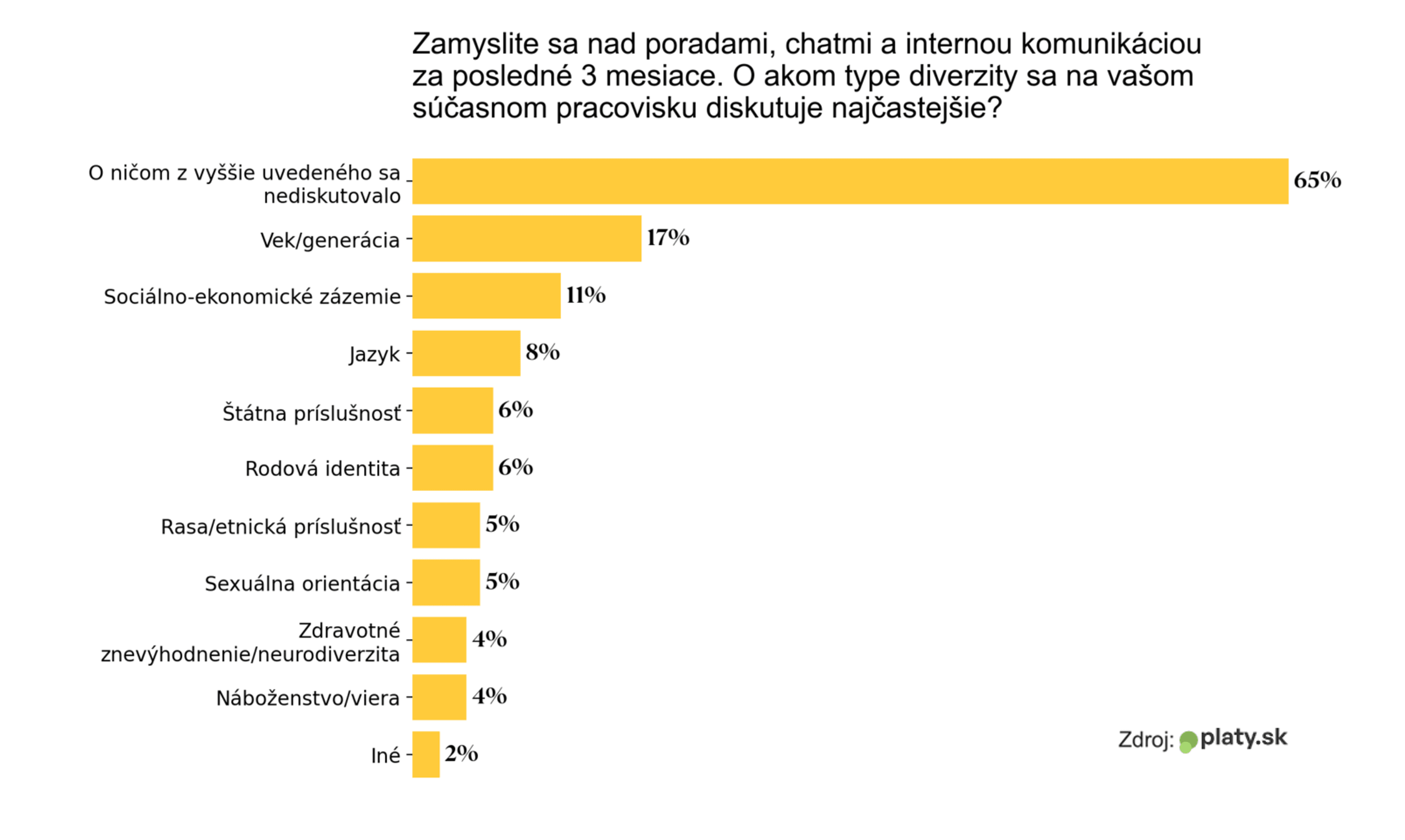 Otvorenosť a inklúziu vie zamestnávateľ podporiť tým, že bude tému aktívne otvárať. Môže organizovať workshopy, prednášky od odborníkov, o svoj príbeh sa možno bude chcieť podeliť aj niekto z kolegov. Avšak až dve tretiny respondentov v prieskume na portáli Platy.sk uviedli, že za posledné 3 mesiace sa na pracovisku nediskutovalo o žiadnom type diverzity. Ak o téme hovorili, najčastejšie išlo o generačné rozdiely, odlišné socio-ekonomické zázemie a jazyk. Debatu o zdravotnom znevýhodnení uviedli len 4 % respondentov.
