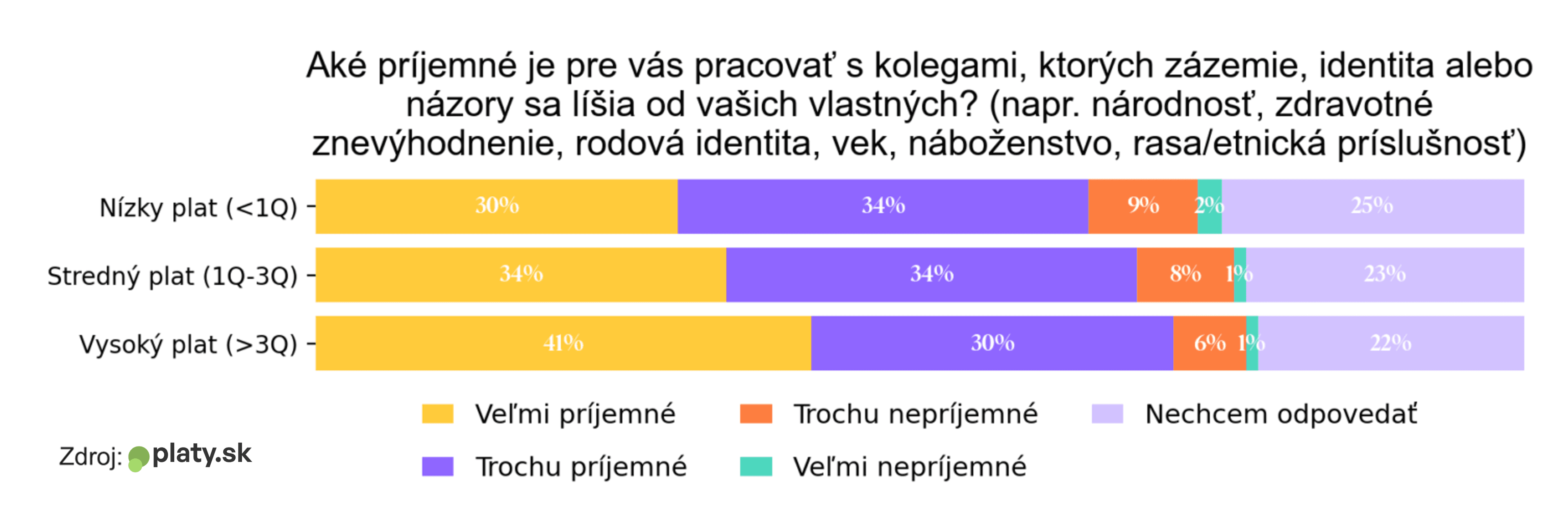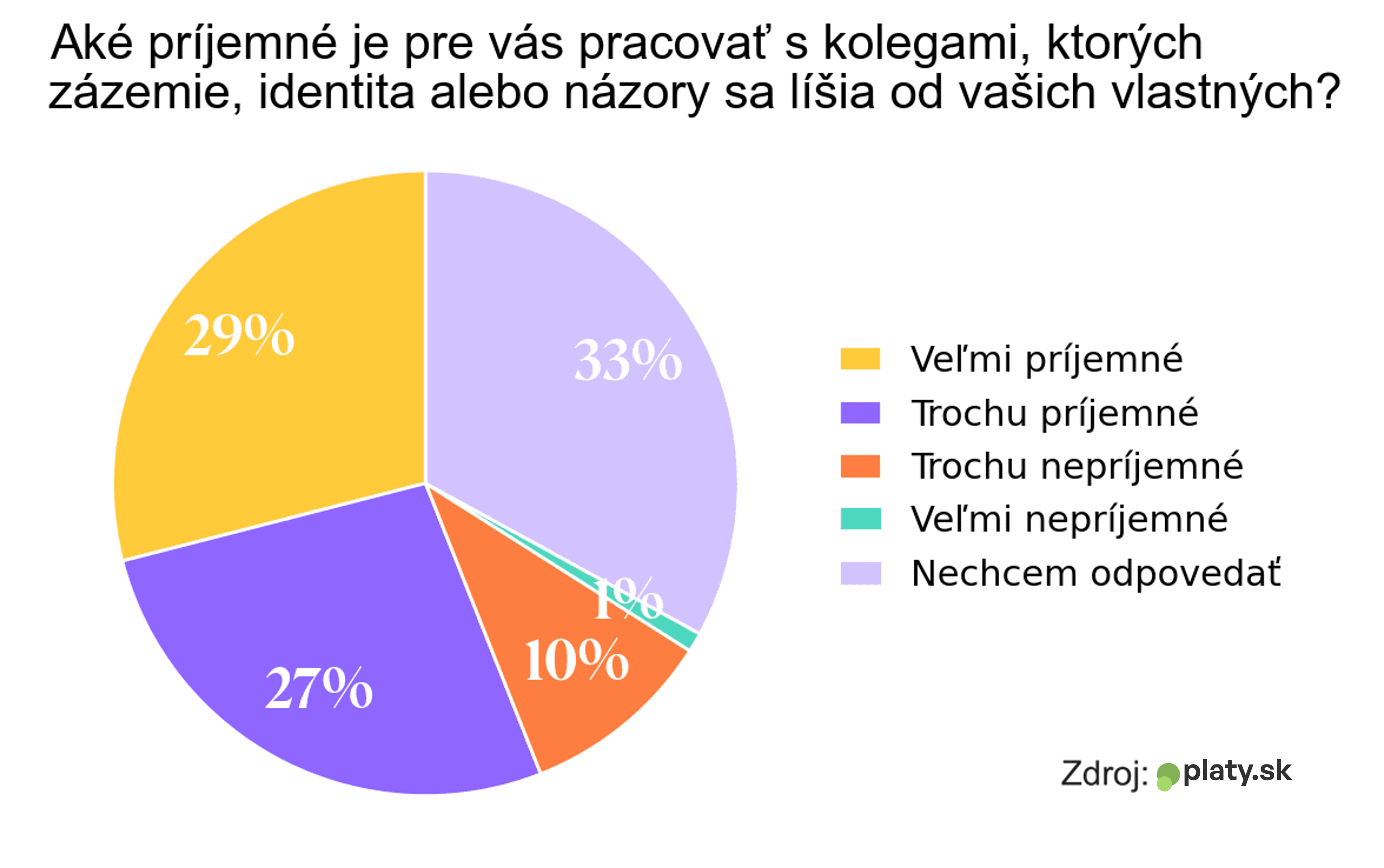 Diverzita na pracovisku má prínos - ľudia s rôznymi životnými príbehmi a skúsenosťami môžu mať odlišné pohľady, čo vie pri strategickom plánovaní či riešení problémov pomôcť. Z prieskumu Alma Career Slovakia v spolupráci s PricewaterhouseCoopers Slovensko, ktorý sa realizoval na portáli Platy.sk, vyplynulo, že 56 % respondentov a respondentiek považuje spoluprácu s kolegami, ktorí majú odlišné zázemie či identitu od ich vlastnej, za príjemné. Ako nepríjemné to vníma desatina. Téma je stále veľmi citlivá, keďže až tretina na túto otázku nechcela odpovedať. Prieskum bol pritom anonymný.