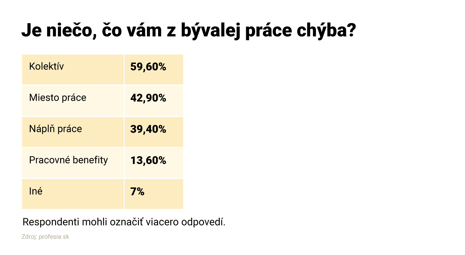 Naopak, bývalí zamestnanci priznávajú, že im chýba ich predošlý pracovný kolektív. Túto možnosť uviedlo až 60 percent respondentov.