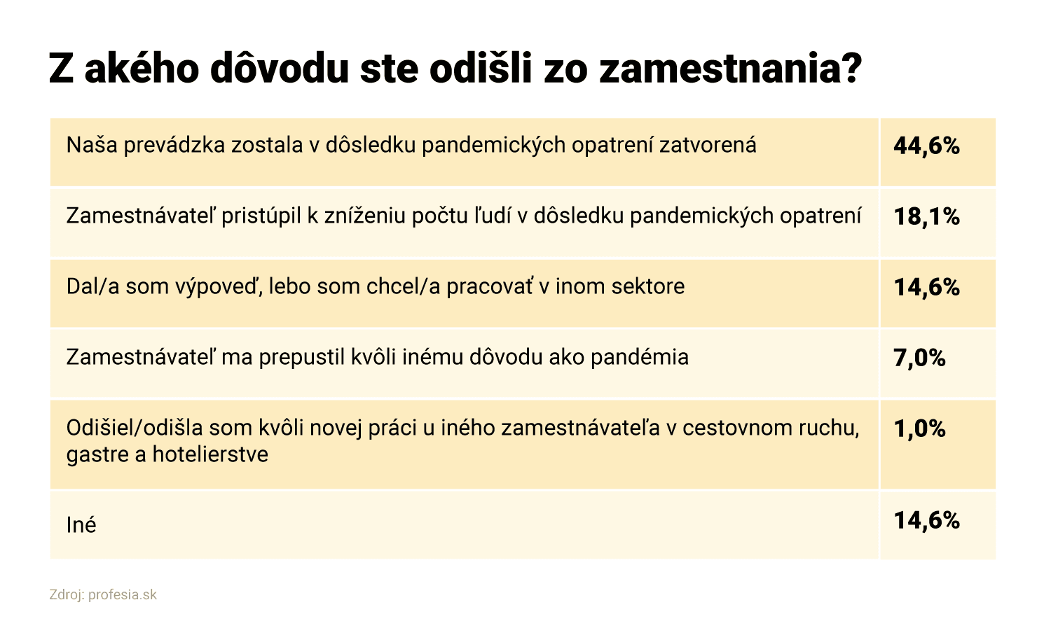 Keď ľudia v odvetví za posledný rok zmenili alebo prišli o prácu, pri 63 percent prípadoch to bolo z dôvodu pandémie. Najčastejším dôvodom bola úplne zatvorená prevádzka alebo zníženie personálu.