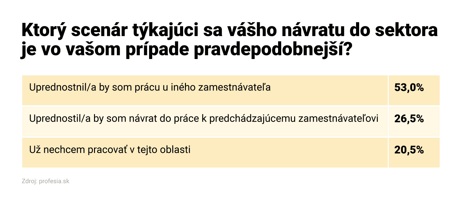 Zaujímavosťou je, že z respondentov, ktorí uviedli, že si vedia predstaviť návrat späť do cestovného ruchu a gastra, by väčšina radšej vymenila svojho predošlého zamestnávateľa a uprednostnila skôr inú firmu.