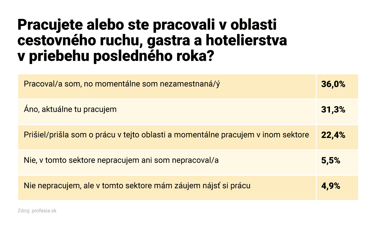 Približne 31 percent ľudí v cestovnom ruchu, gastre a hotelierstve stále pracuje. Naopak, takmer štvrtina potvrdila, že po tom, čo o prácu prišla, si našla nové zamestnanie inde.