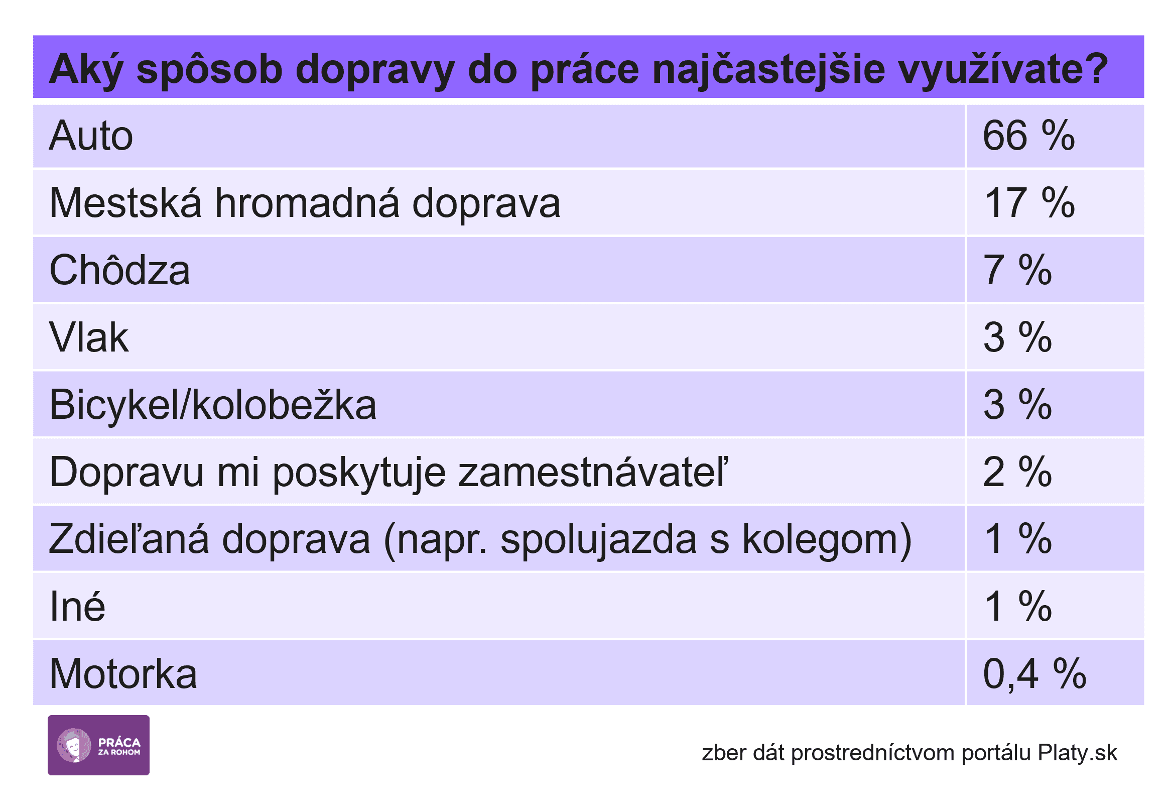 Z prieskumu pre aplikáciu Práca za rohom vyplynulo, že najčastejšie pracujúci na Slovensku využívajú na cestu do práce auto. Spomedzi tých, ktorí musia dochádzať na pracovisko, či už pravidelne alebo občas, využívajú dominantne tento spôsob dopravy dve tretiny. Len 17 percent využíva ekologickejšiu možnosť - mestskú hromadnú dopravu.