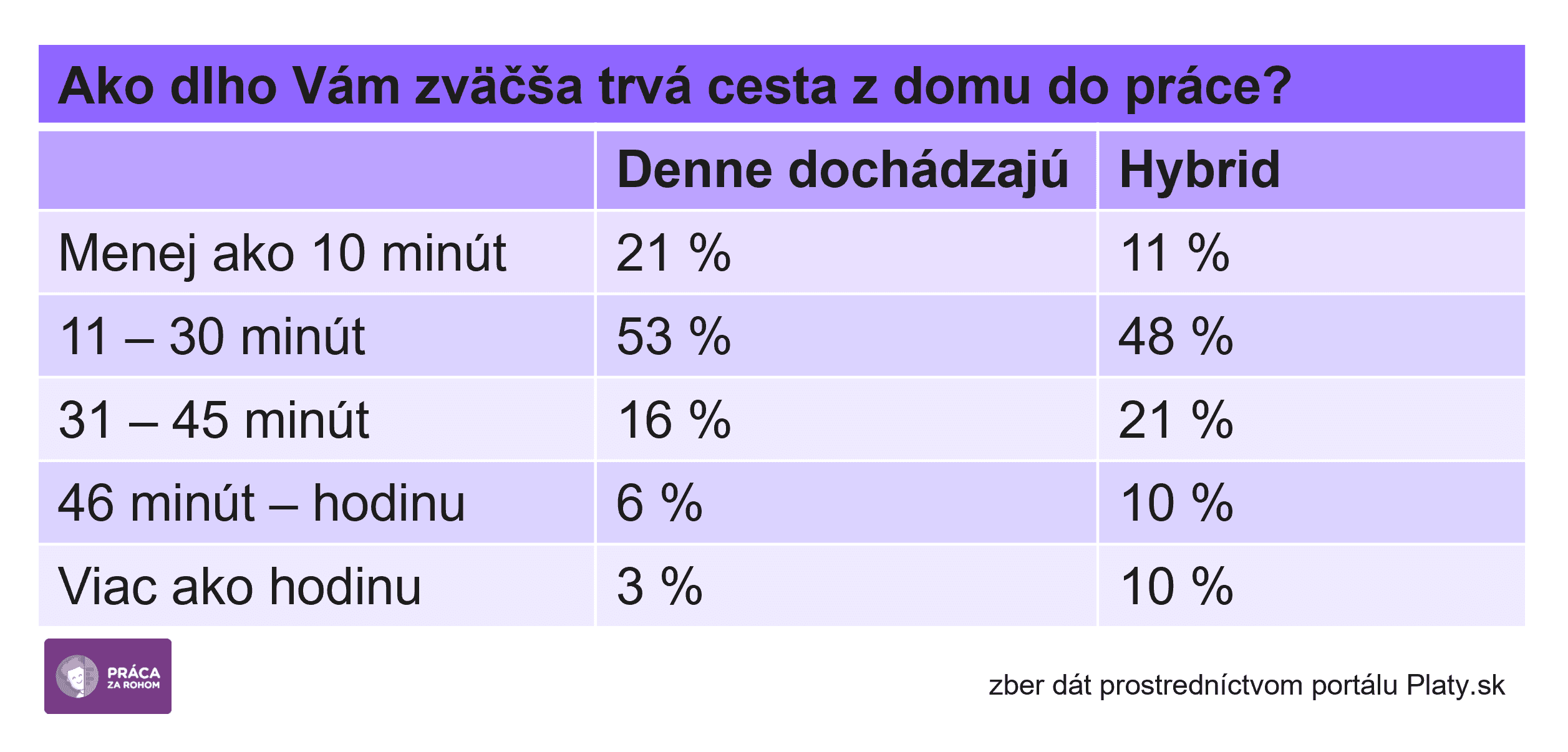 Blízkosť pracoviska k domovu je pre zamestnancov veľmi dôležitá a lepšia dostupnosť je jedným zo silných motivátorov k zmene práce. To, že ľudia chcú mať prácu blízko k domovu potvrdzujú aj výsledky prieskumu pre Prácu za rohom, najmä u tých, ktorí musia na pracovisko dochádzať každý deň a nemajú možnosť pracovať z domu. Spomedzi nich viac ako 70 percentám netrvá cesta do práce viac ako polhodinu.