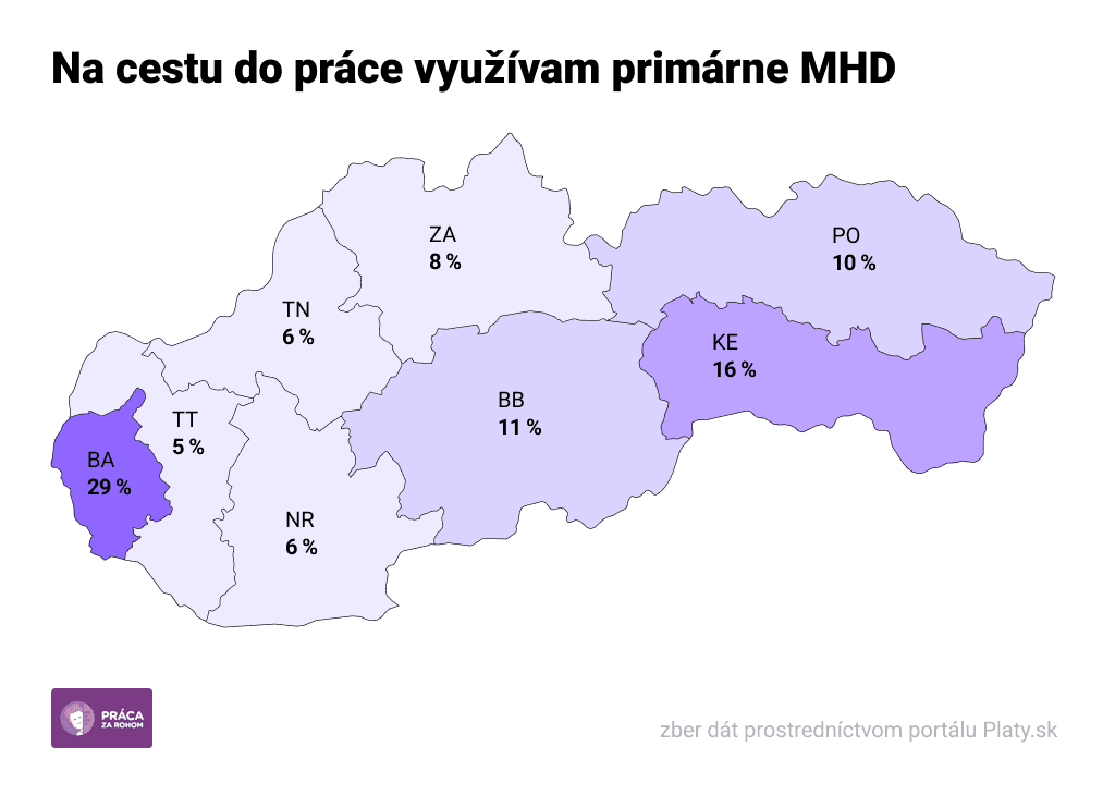 Naprieč regiónmi je všade najčastejšou voľbou na cestu do práce auto. No zatiaľ čo v Nitrianskom či Trenčianskom kraji využíva túto formu až okolo 80 percent pracujúcich, v Bratislavskom kraji polovica. V hlavnom meste a okolí využíva MHD takmer 30 percent pracujúcich, čo je suverénne najviac.
