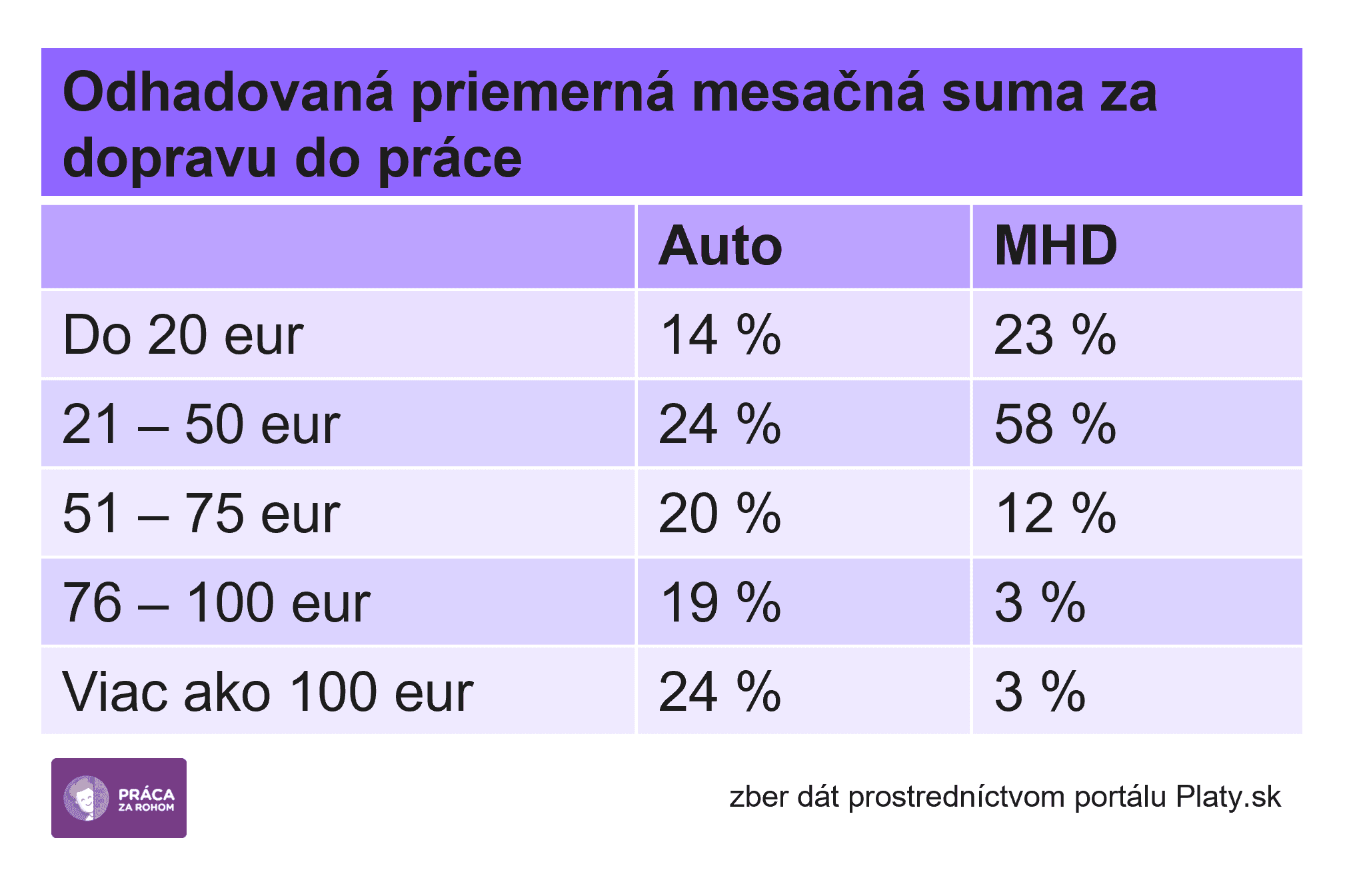 Na dopravu do práce zamestnanci vynakladajú nemalé peniaze. Tretina minie mesačne 21 až 50 eur, pätina viac ako 100 eur. Najvyššie výdavky majú tí, ktorí cestujú autom. V ich prípade dá na prepravu na pracovisko viac ako 100 eur mesačne štvrtina, spomedzi tých, ktorí najčastejšie využívajú mestskú hromadnú dopravu, investujú túto sumu len 3 percentá.