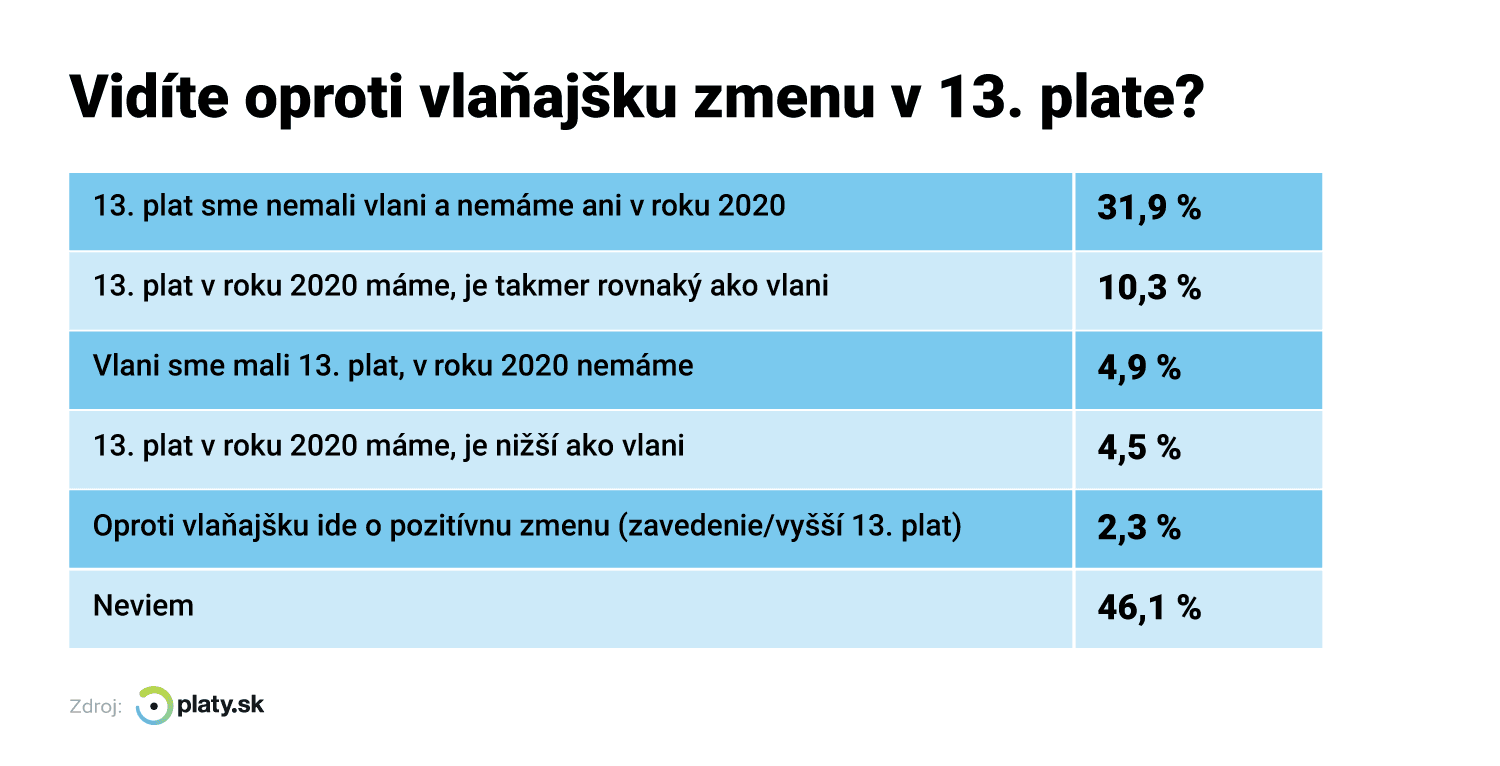 Naopak, zvýšenie či zavedenie trinásteho alebo štrnásteho platu zažilo v roku 2020 len minimum respondentov. V prípade trinásteho platu išlo iba o 2,3 percenta a v prípade štrnásteho platu iba iba o 1,4 percenta Slovákov.