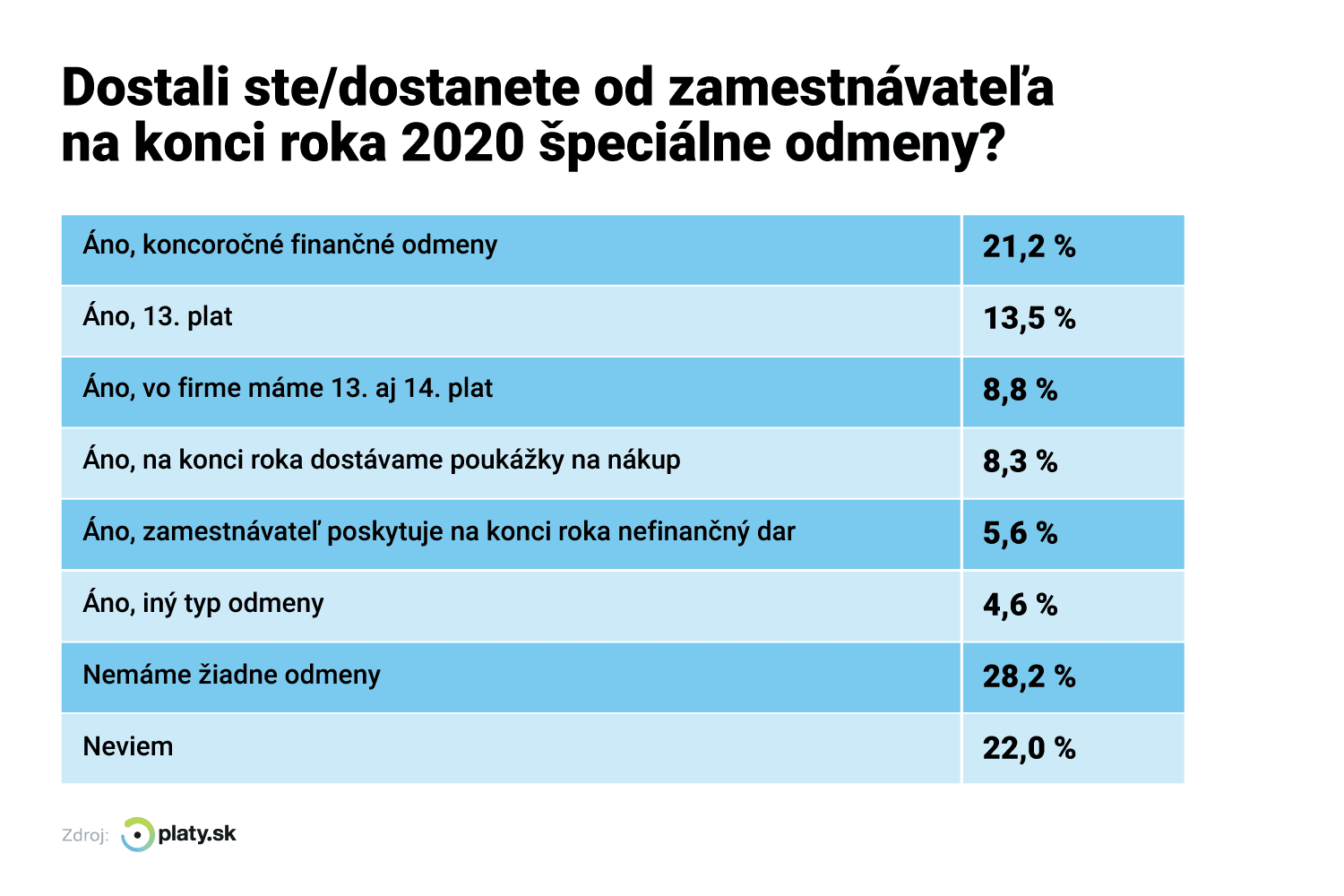 Výsledky prieskumu ukázali, že koncoročné odmeny dostane alebo dostalo v tomto roku 21 percent zamestnancov. Trinásty plat je rozšírený menej. V roku 2020 ho má k dispozícii necelých 14 percent Slovákov. Štrnásty plat necelých deväť percent.