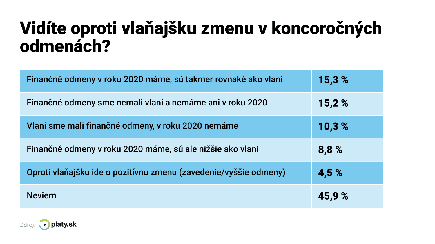 Takmer 19 percent respondentov tvrdí, že finančné odmeny sa oproti vlaňajšku pohoršili – buď sa znížili alebo tento rok vôbec neboli. Naopak, iba necelých päť percent ľudí odpovedalo, že finančné odmeny boli v roku 2020 pozitívnejšie ako v roku 2019.