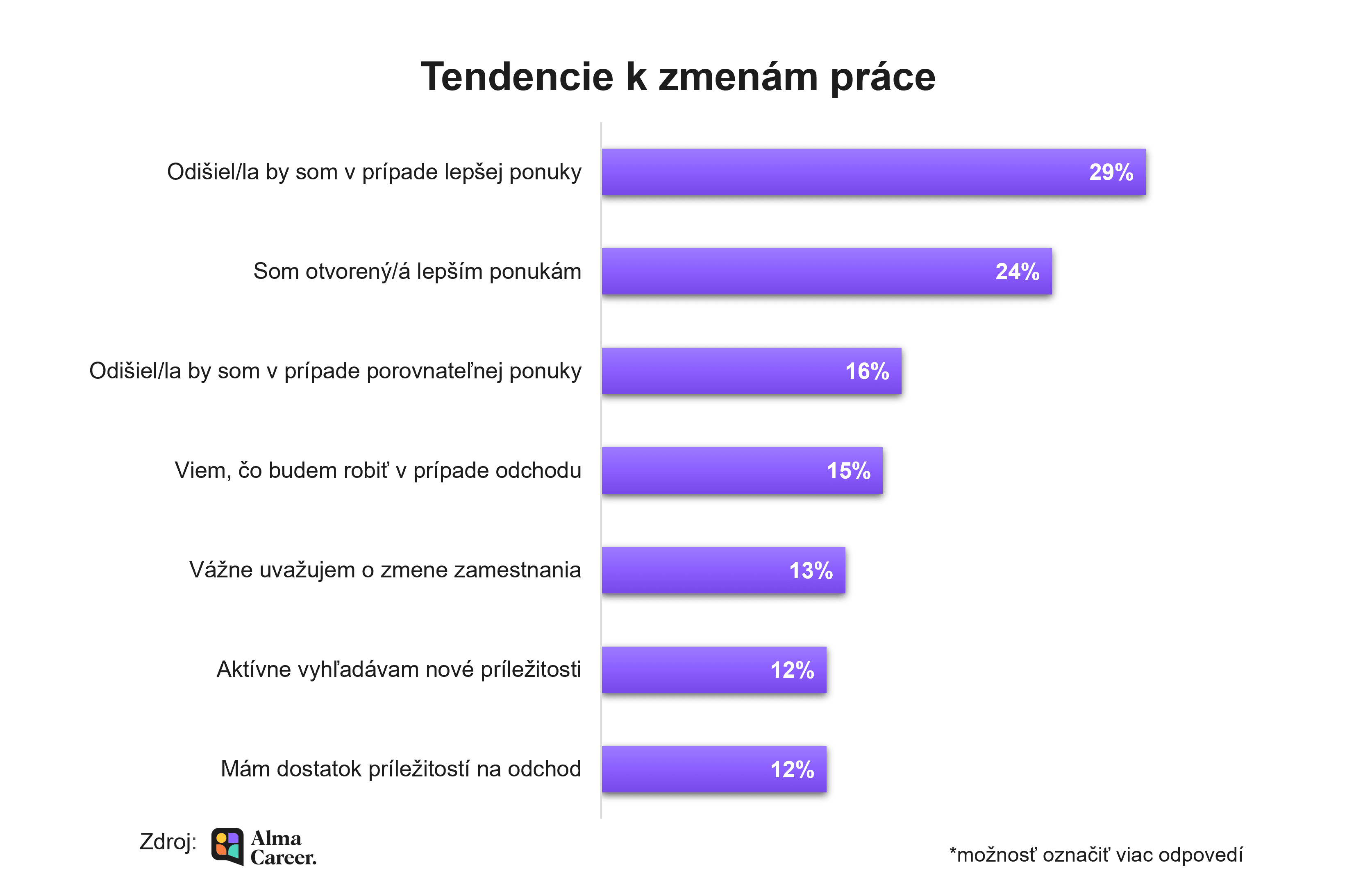 Prieskum sa zároveň zameral aj na celkové tendencie k zmene zamestnania. Takmer tretina ľudí (29 percent) je pripravená odísť zo súčasnej práce v prípade lepšej ponuky a štvrtina (24 percent) je otvorená novým možnostiam. Zaujímavé je, že 16 percent pracujúcich by uvažovalo o zmene práce aj vtedy, ak by bola nová ponuka porovnateľná s tou súčasnou.