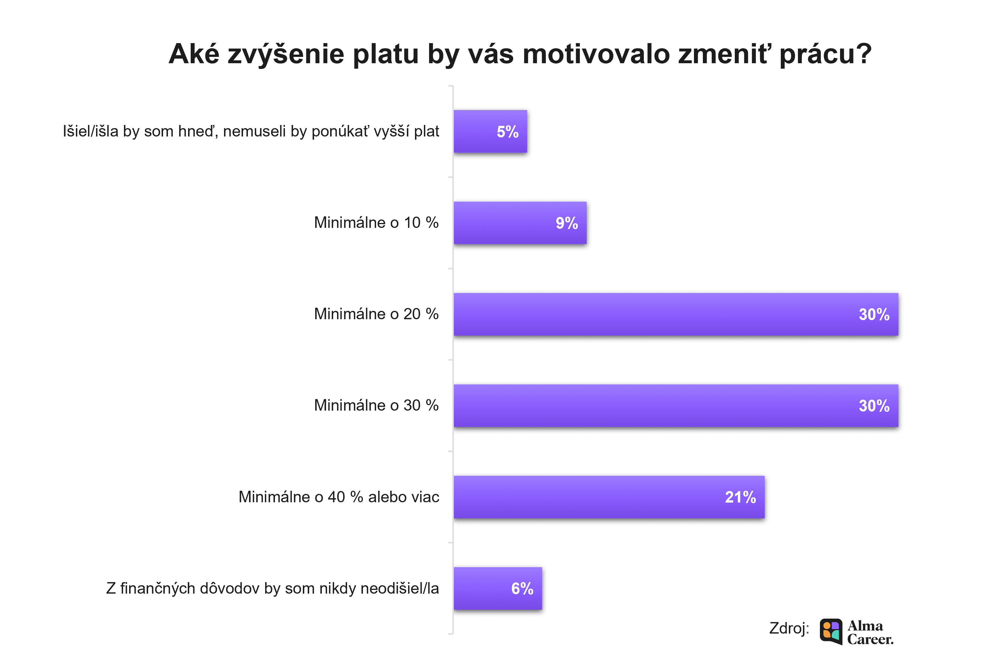 Prieskum JobsIndex spoločnosti Alma Career Slovakia ukazuje, že takmer dve tretiny zamestnancov by odišli zo svojej práce pri ponuke s o 20 až 30 percent vyšším platom. Len malá skupina pracujúcich, 6 percent, by z finančných dôvodov nikdy neuvažovala o odchode, o čosi menšia skupina by odišla do iného zamestnania hneď, aj keby im neponúkli vyšší plat.