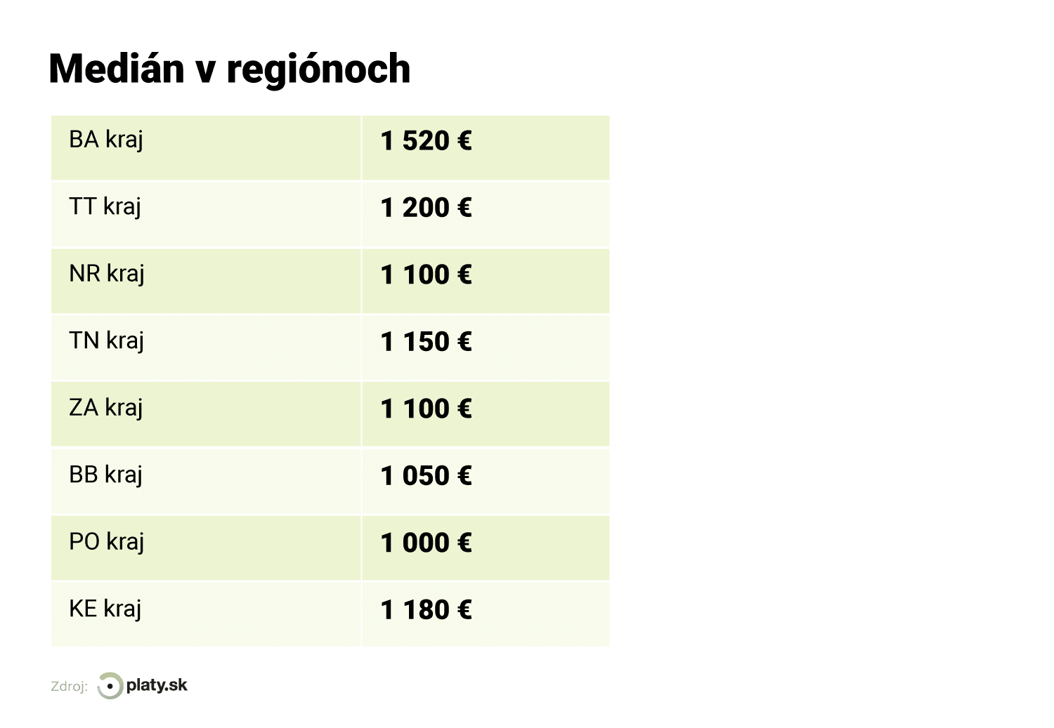 Porovnanie mediánov v jednotlivých krajoch ukazuje výrazný rozdiel medzi hlavným mestom a zvyškom Slovenska. V Bratislave a okolí zarobila iba polovica zamestnancov pod 1520 eur v hrubom.