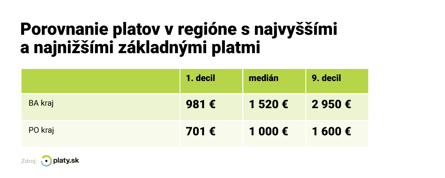 Analýza portálu Platy.sk potvrdzuje, že najväčšie regionálne rozdiely vidieť medzi Bratislavským a Prešovským krajom. Kým v hlavnom meste zarobila v roku 2021 presne polovica zarábajúcich nad 1520 eur, v Prešove a okolí sú takéto platy považované skôr za výnimočné. Nad 1600 eur v hrubom tu napríklad vlani zarábala len najlepšia desatina zamestnancov.