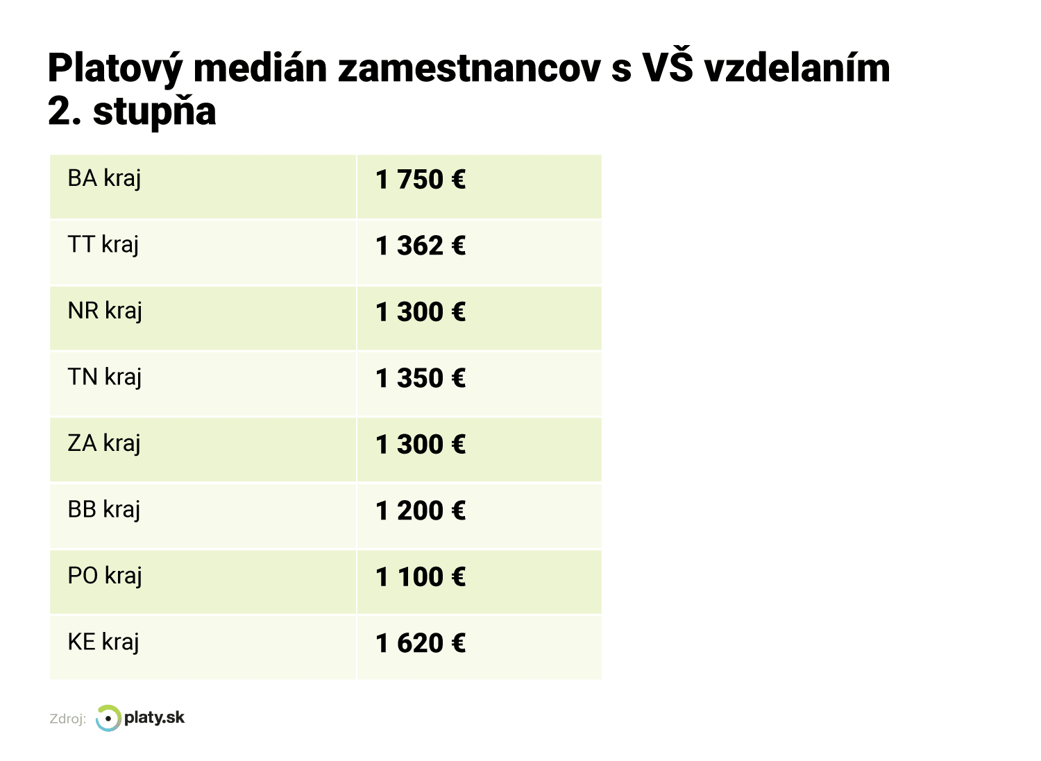 Pri zamestnancoch, ktorí majú vysokoškolské vzdelanie 2. stupňa, sú regionálne rozdiely v mnohých prípadoch ešte výraznejšie. Iba polovica ľudí v Bratislavskom kraji mala vlani nižší plat ako 1750 eur v hrubom. V Prešovskom kraji predstavuje medián len 1100 eur v hrubom.