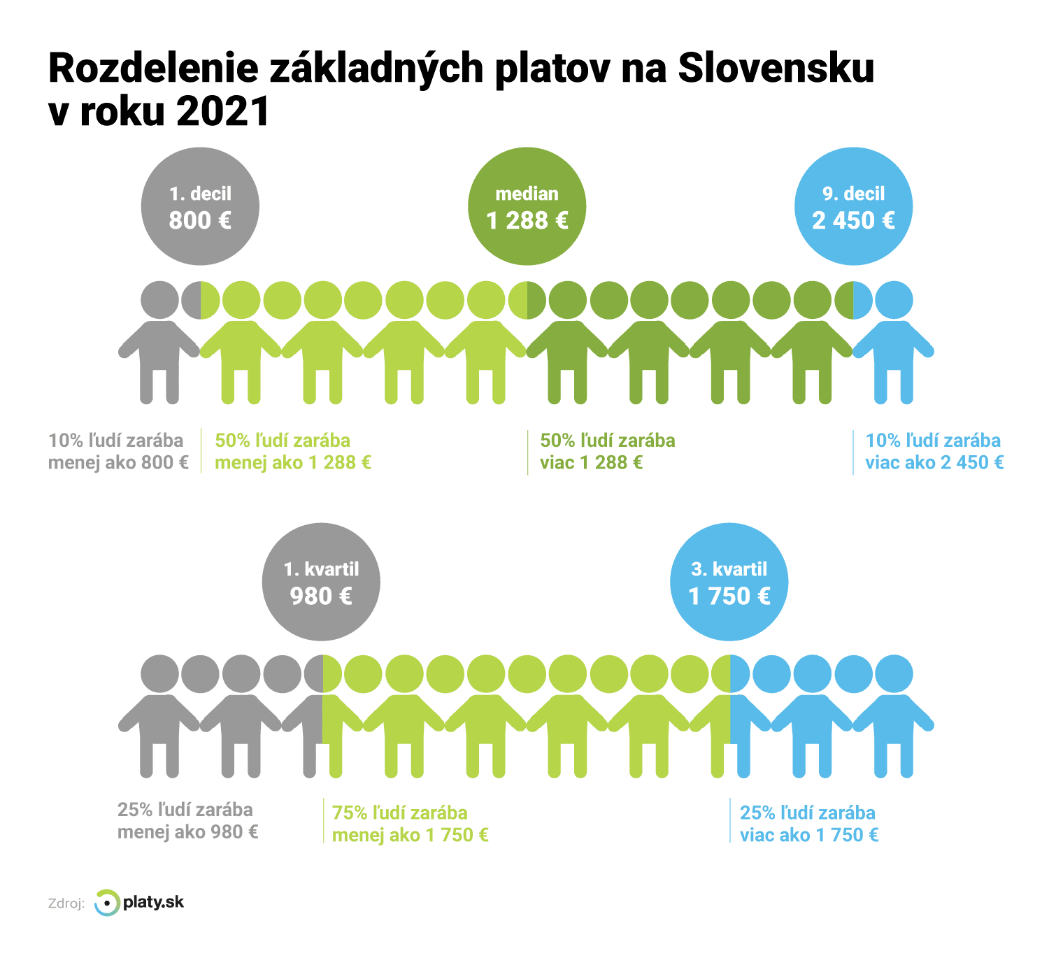 Naopak, keď sa pozrieme na druhý koniec, teda najlepšie zarábajúcu desatinu Slovákov, jej základný plat bol v roku 2021 vyšší ako 2450 eur v hrubom. Táto časť zamestnancov zarobila mesačne viac ako 1790 eur v čistom. (V prípade, že nemala deti a uplatňovala si nezdaniteľnú časť základu dane.)