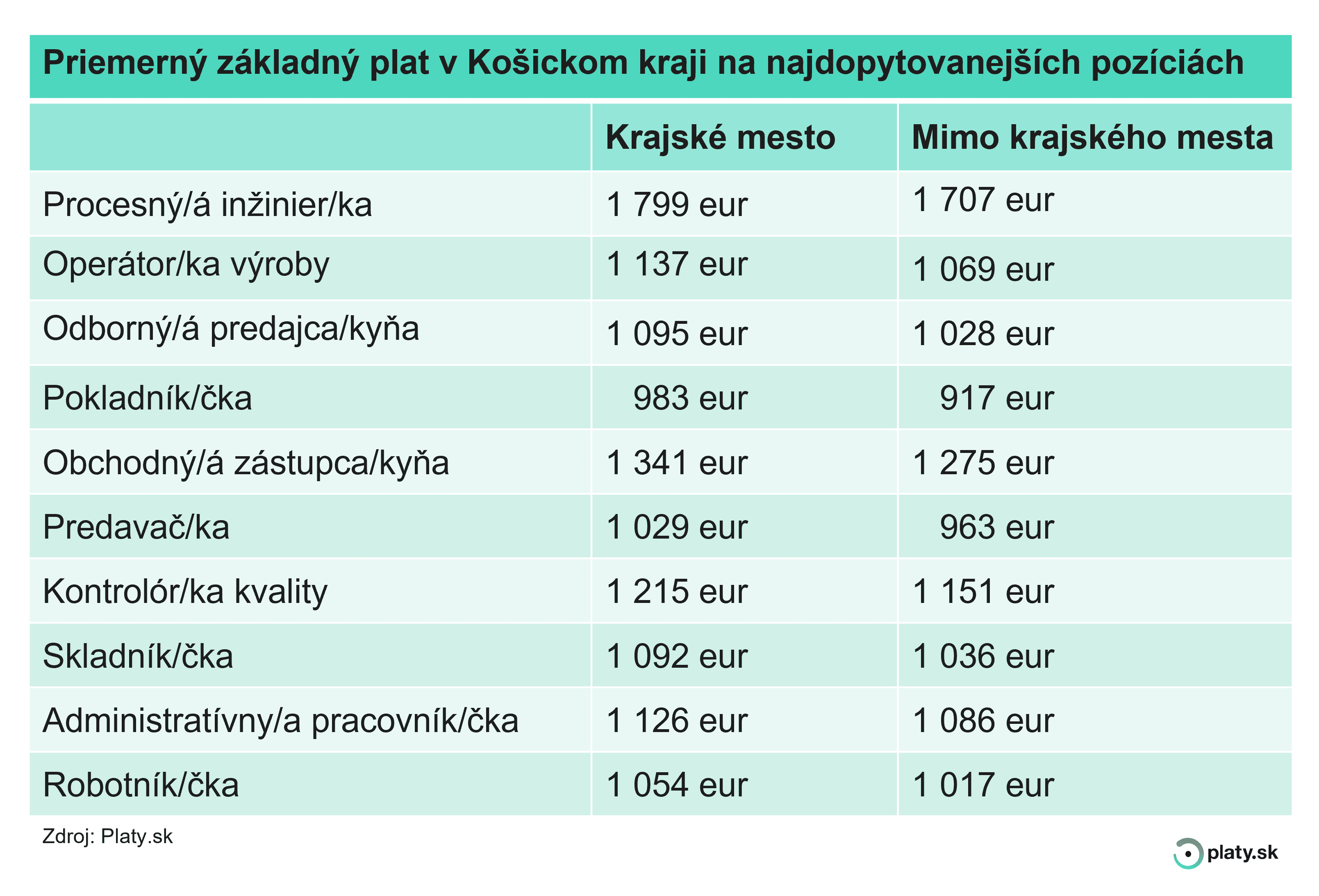 Medzi pozíciami, na ktoré tento rok firmy v Košickom kraji najčastejšie hľadali cez portál Profesia.sk posily, patria predavači, operátori výroby a odborní predajcovia, ale v najdopytovanejšej desiatke sú aj robotníci či kontrolóri kvality. Vo všetkých prípadoch je na základe dát portálu Platy.sk rozdiel v priemernej základnej mesačnej mzde v krajskom meste a mimo neho. Platy v Košiciach sú oproti zvyšným mestám a obciam vyššie o desiatky eur.