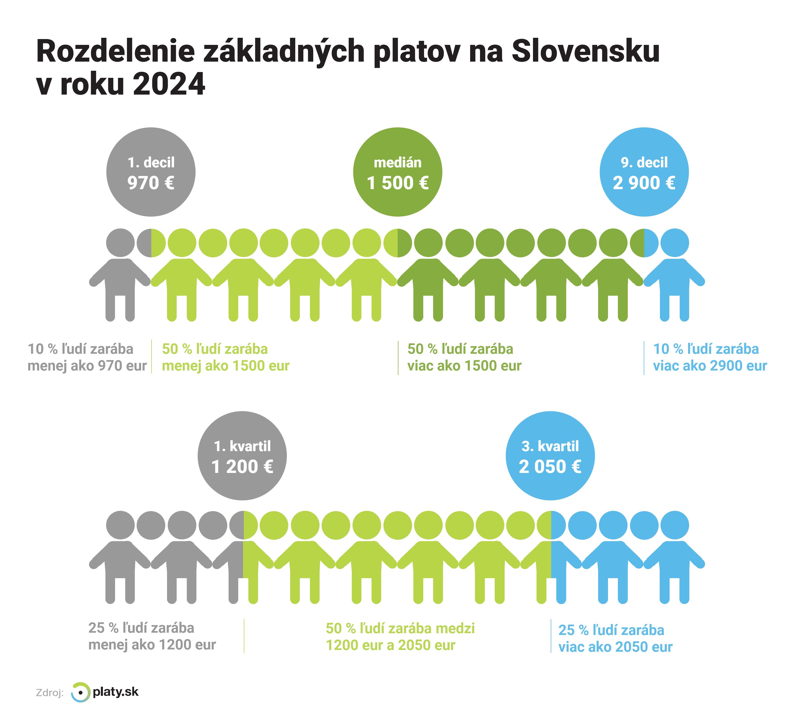 Z dát portálu Platy.sk vyplýva, že vlani zarábalo 10 percent ľudí pracujúcich na Slovensku do 970 eur mesačne v hrubom, štvrtina mala menej ako 1 200 eur. Na druhej strane, 25 percent pracujúcich s najvyššími príjmami malo cez 2 050 eur, najlepšie zarábajúca desatina sa dostala cez 2 900 eur.
