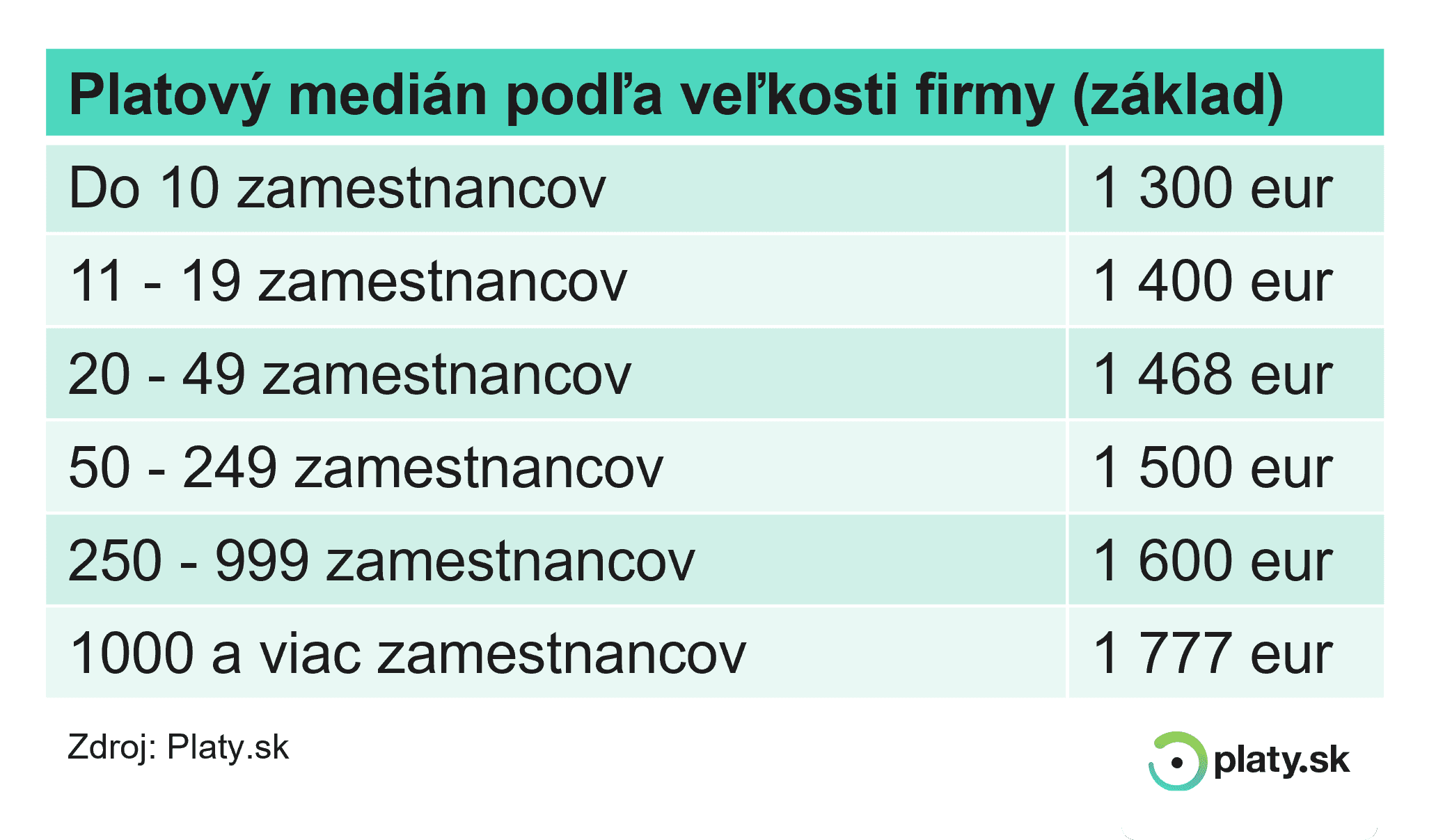 Z analýzy dát z Platy.sk vyplynulo, že najviac zarábajú ľudia, ktorí pracujú vo veľkých firmách. Polovica tých, ktorí pôsobia v spoločnostiach s vyše 1 000 zamestnancami, zarába viac ako 1 777 eur, najlepšie platená desatina si mesačne prilepší o 3 200 eur a viac. 10 percent zamestnancov a zamestnankýň s najnižším príjmom má v najväčších firmách do 1 070 eur.