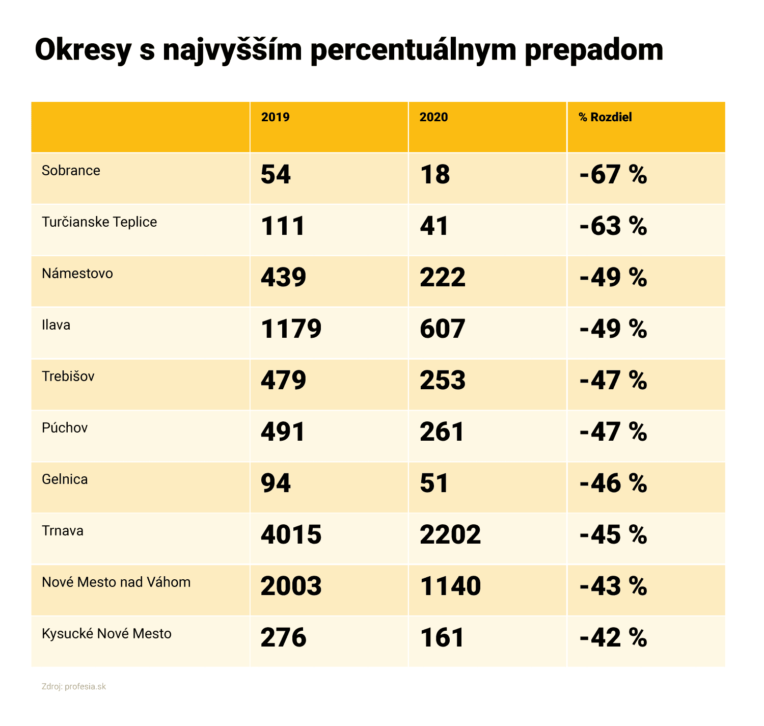 Naopak, ak pozrieme na to, kde sa ponuka najviac zúžila, na prvom mieste skončili Sobrance. Vlani priniesol prvý polrok do tohto okresu celkovo 54 ponúk, tento rok išlo iba o 18 inzerátov. To predstavuje prepad o 67 percent. Podobný pokles zaznamenala Profesia aj v Turčianskych Tepliciach, kde poklesol počet ponúk o 63 percent.