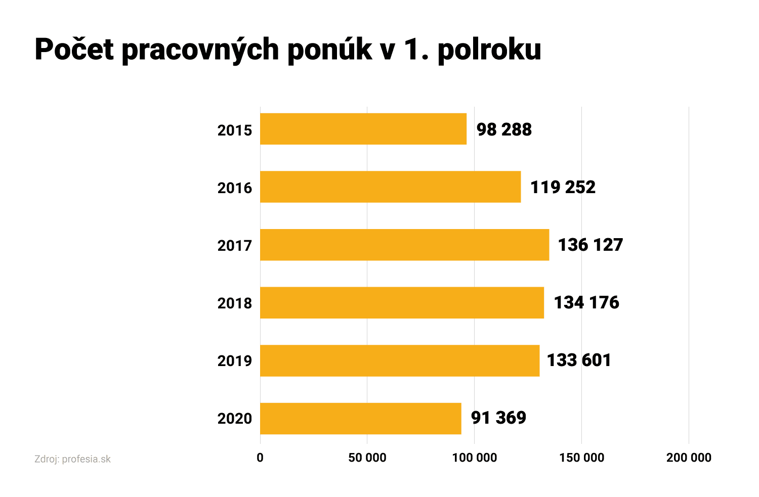 V porovnaní s predošlými obdobiami ide o najnižšie číslo za posledných šesť rokov. Menej ponúk za prvý polrok sme na najväčšom pracovnom portáli evidovali ešte v roku 2014. Vtedy zamestnávatelia uverejnili 76 110 pracovných inzerátov.