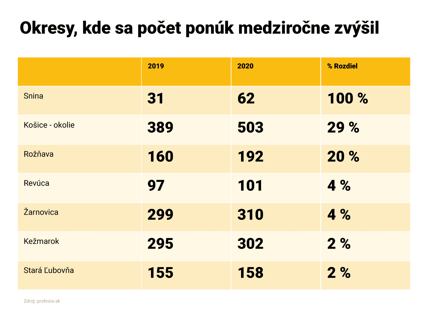 Portál Profesia.sk eviduje aj miesta práce s vyšším počtom pracovných ponúk ako tomu bolo v roku 2019. Reč je najmä o okresoch s nižším počtom ponúk. Takýmto prípadom je napríklad Snina. Portál tu vlani počas prvého polroka evidoval 31 inzerátov. Tento rok bol počet ponúk dvojnásobný.