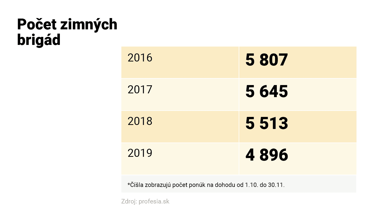 Keď porovnáme počet zimných brigád s troma predošlými rokmi, môžeme vidieť, že ide aktuálne ide o najnižšie číslo.