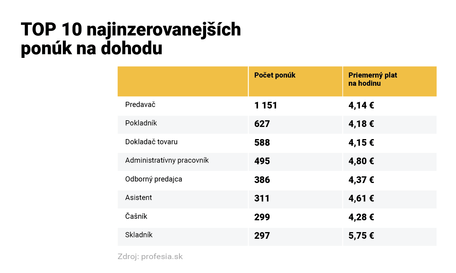Na ďalších miestach skončili pozície ako telefonický operátor, marketingový pracovník, asistent, administratívny pracovník, balič, barista či kuriér.