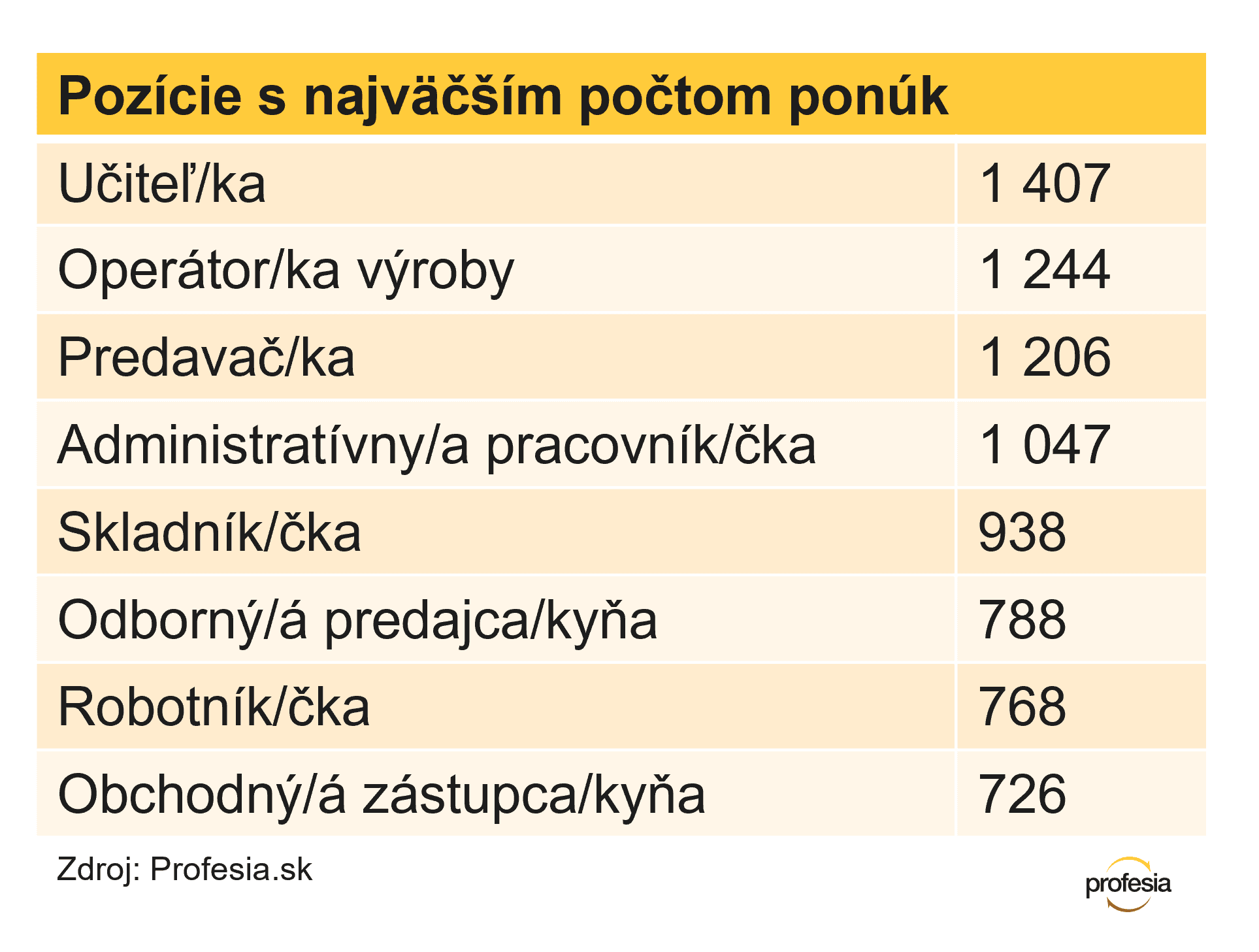 K 24. júnu 2025 bolo na portáli Profesia.sk zverejnených 1 407 pracovných ponúk na učiteľov a učiteľky. Druhý operátor výroby mal o 160 inzerátov menej. Profesia učiteľa predčila aj predavačov či administratívnych pracovníkov.