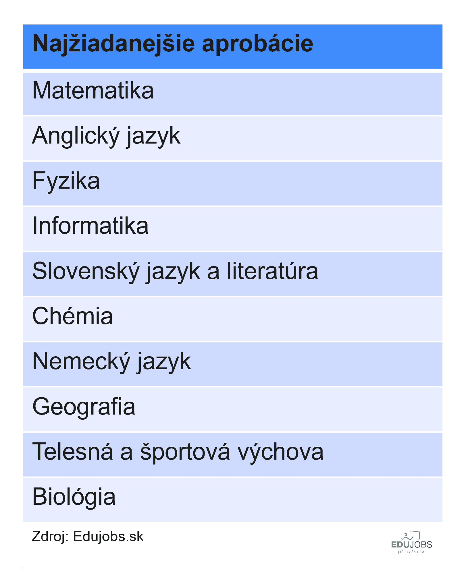Najviac chýbajú učitelia a učiteľky matematiky, momentálne je ich spomedzi ponúk na základné a stredné školy viac ako pätina. Školy tiež hľadajú viac ako 140 angličtinárov, 125 fyzikárov a takmer 100 učiteľov a učiteliek informatiky.