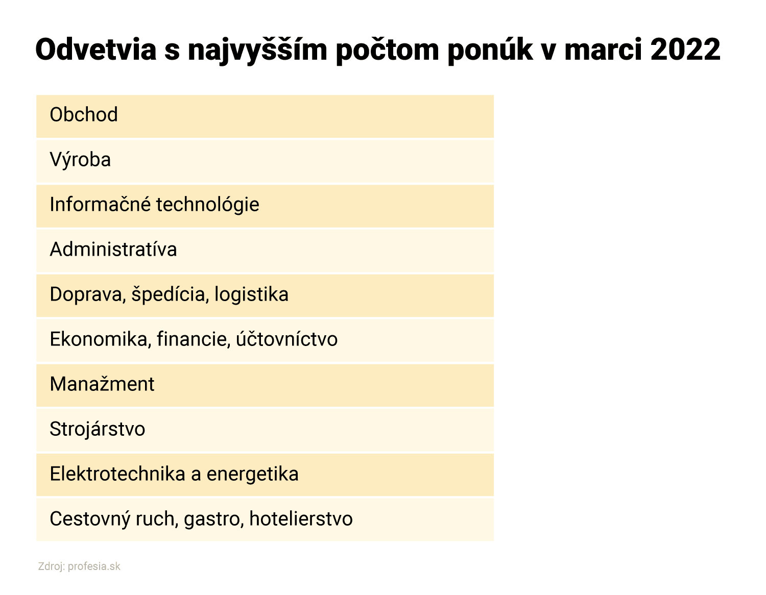 Počas marca zamestnávatelia publikovali najviac pracovných ponúk v odvetví obchodu, tieto ponuky predstavovali 18 percent z celkového počtu pridaných inzerátov. Hľadali sa zamestnanci na pozície predavač/predavačka, odborný predajca/predajkyňa alebo pokladník/pokladníčka.