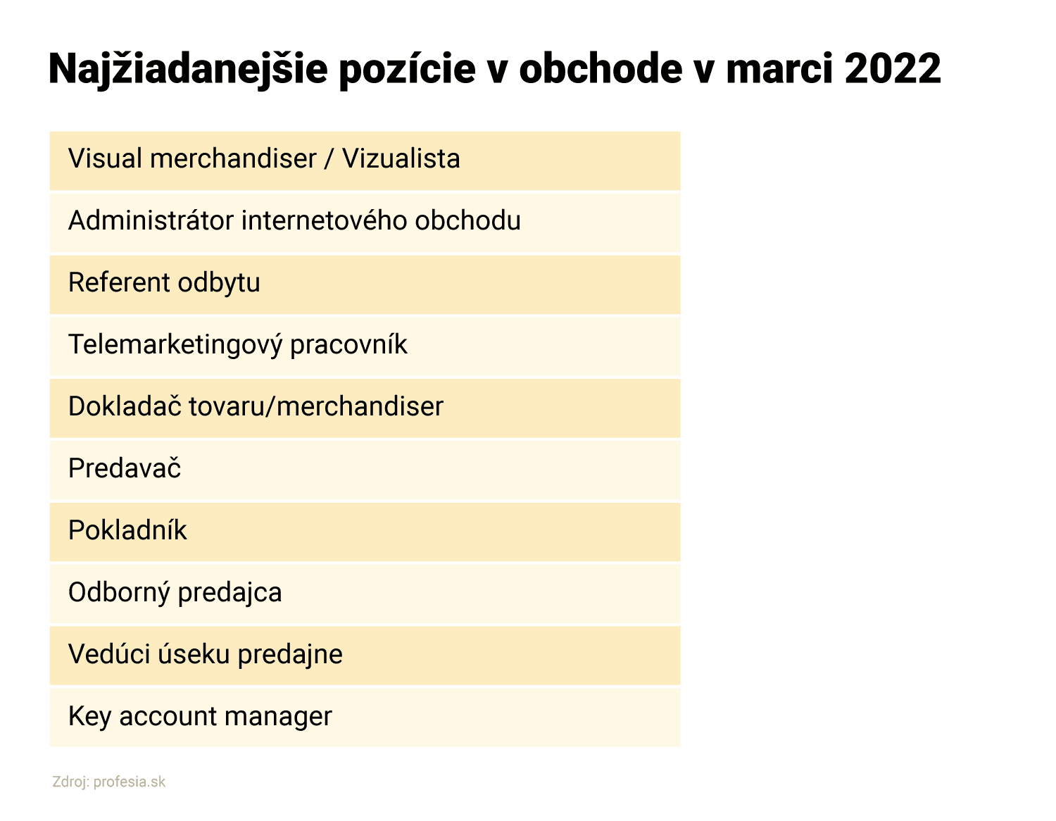 Mnoho zamestnávateľov chce uchádzačov osloviť aj kreatívne nazvanou pozíciou a zjavne to funguje. Ponuka Visual merchandiser / Vizualista, ktorú nájdete v oblasti obchodu, v marci zaznamenala takmer 45 reakcií na 1 pracovnú ponuku. Ľudia sa však v tomto segmente zaujímajú aj o pracovné miesto administrátora/ky internetového obchodu či referenta/ky odbytu. V oblasti výroby najviac reakcií Profesia zaznamenala na pozíciách vedúceho/vedúcej prevádzky, baliča/ky alebo predáka/predáčky.