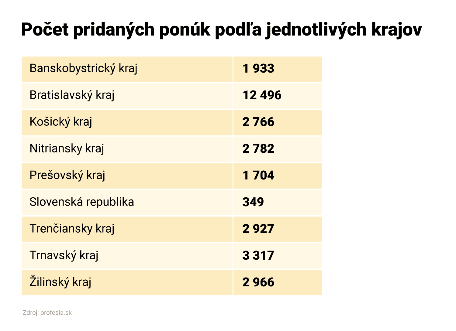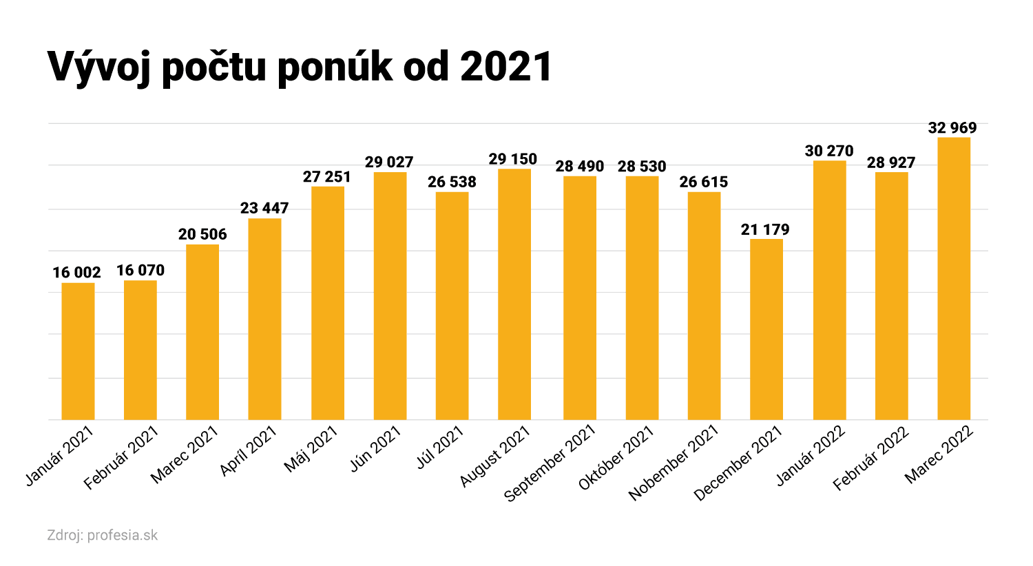 Počet ponúk pre uchádzačov o zamestnanie stále rastie. Oproti januáru minulého roka sa počet pracovných príležitostí zdvojnásobil. Viac ako 12-tisíc pozícií ponúkajú zamestnávatelia v Bratislavskom kraji. Voľné pracovné miesta sú však vo všetkých regiónoch. Viac než 3 300 zamestnancov potrebujú získať v Trnavskom kraji, ale takmer 3-tisíc pozícií čaká na uchádzačov a uchádzačky o zamestnanie aj v Žilinskom a Trenčianskom, Nitrianskom či Košickom kraji. Zamestnávatelia pri pridávaní inzerátov čoraz častejšie označujú aj pracovné ponuky, ktoré sú vhodné pre ľudí z Ukrajiny. Počas minulého mesiaca tvorili už 11 percent z celkového počtu publikovaných inzerátov.