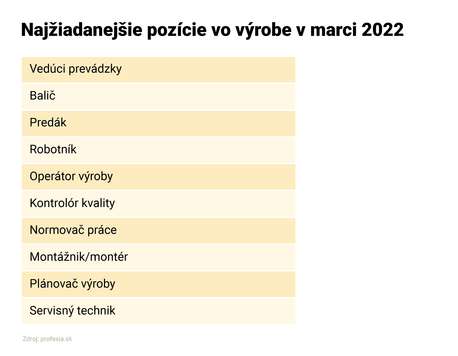 Mnoho firiem sa stále usiluje získať zamestnancov do výroby, z celkového množstva pozícií ich bolo 15 percent. Zamestnávatelia majú záujem o operátorov/operátorky výroby, skladníkov/skladníčky, robotníkov/robotníčky, montážnikov/montážničky.