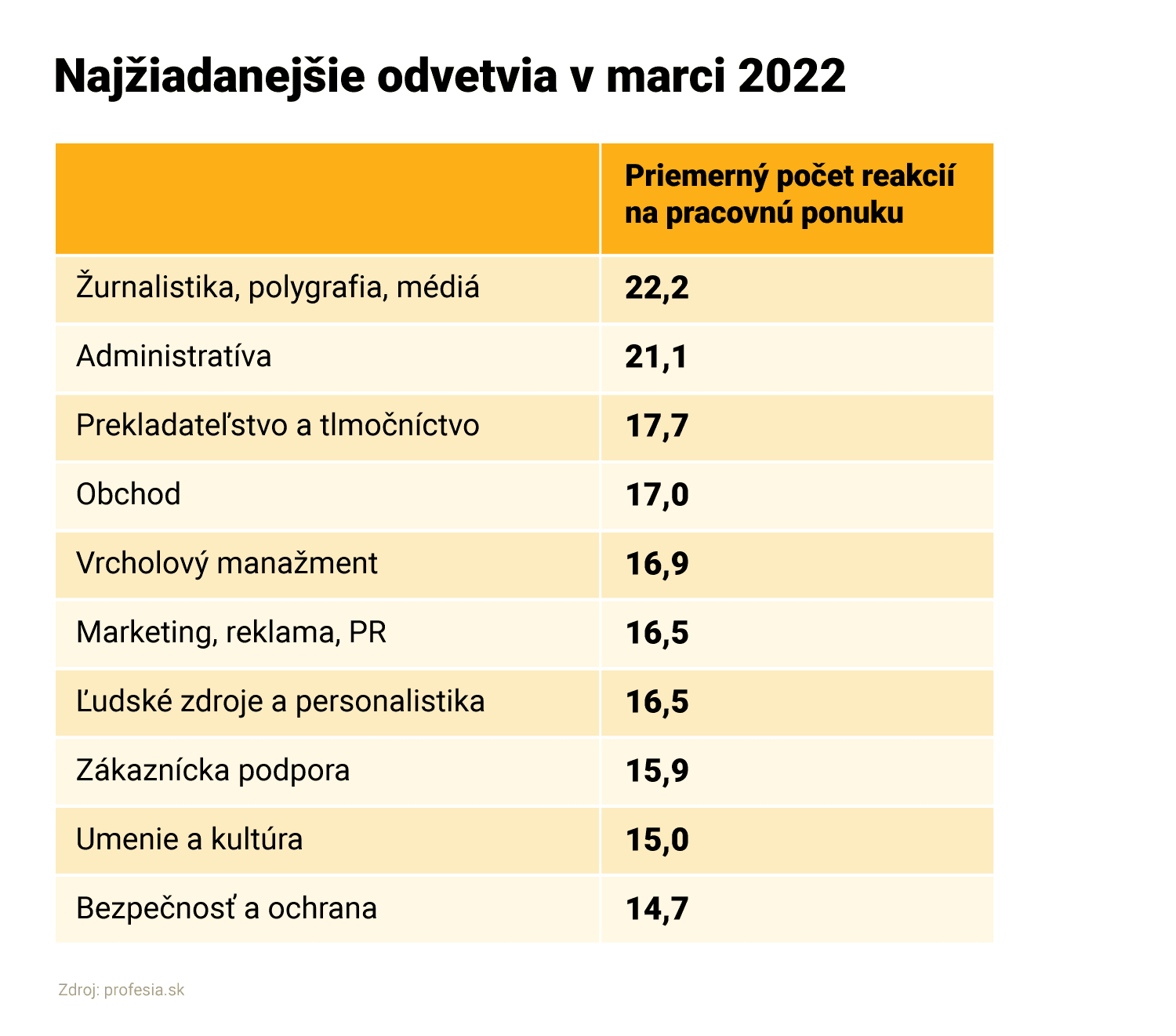 Najviac kandidátov a kandidátok počas minulého mesiaca reagovalo na ponuky v segmente žurnalistika, polygrafia a médiá. Atraktívnou je pre uchádzačov a uchádzačky o zamestnanie oblasť administratívy. Väčší počet záujemcov reflektuje aj na zverejnené ponuky v odvetví prekladateľstvo a tlmočníctvo.