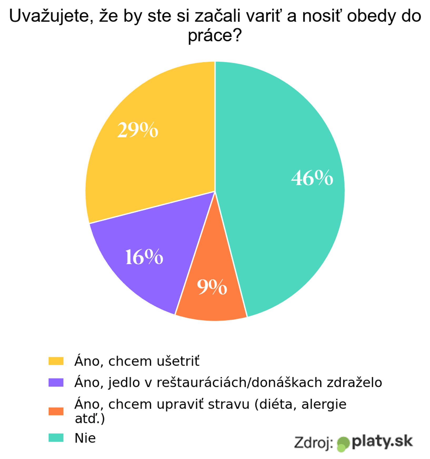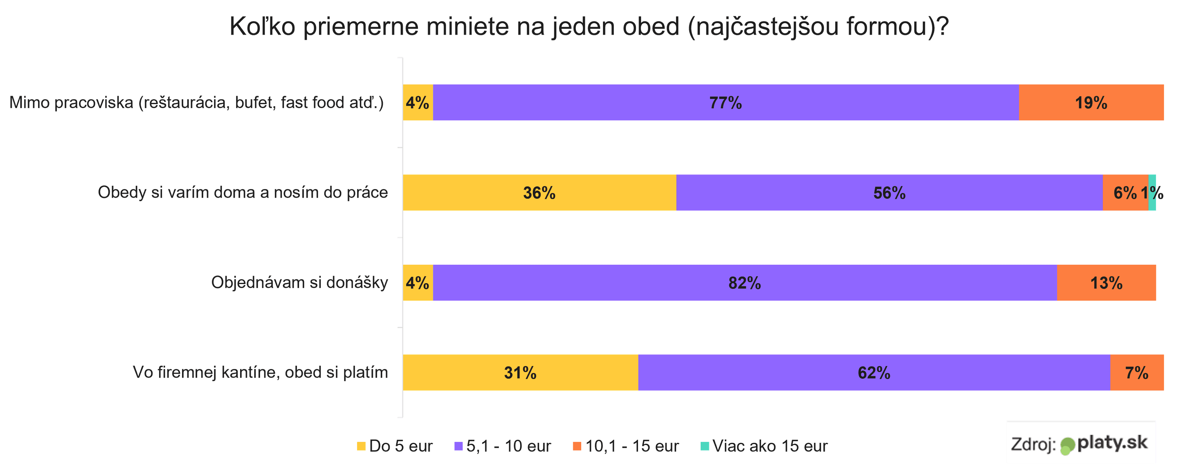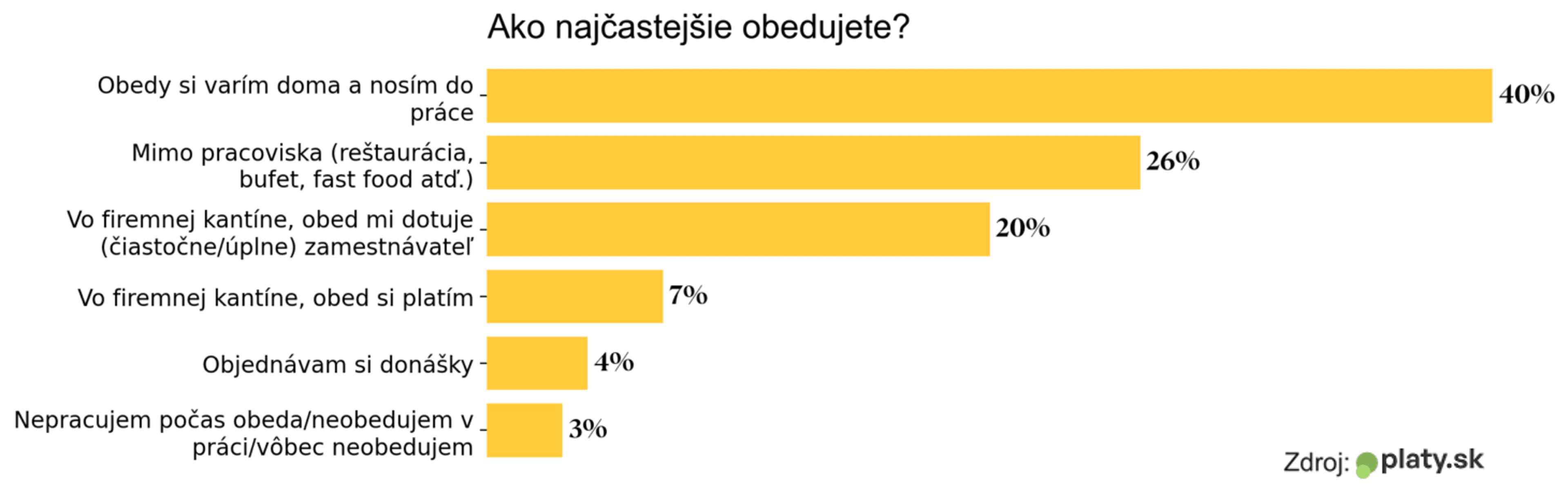 Pre mnohých sa stalo dennodenné stravovanie mimo domu luxusom. Najväčšia časť pracujúcich, ktorí chodia na pracovisko, si obed navarí doma a prinesie si ho do práce, tvrdí to 40 % respondentov v prieskume portálu Platy.sk. Do reštaurácií, bufetov či prevádzok rýchleho občerstvenia chodí na obed len štvrtina.