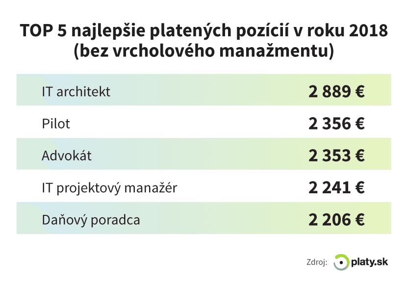 Keď sa pozrieme na najlepšie platené pozície mimo vrcholového manažmentu, tak nie je veľkým prekvapením, že na prvom mieste je IT povolanie. Priemerný základný plat IT architekta je 2889 eur v hrubom, čo je a ž o 179 percenta viac ako celoslovenská priemerná mzda.